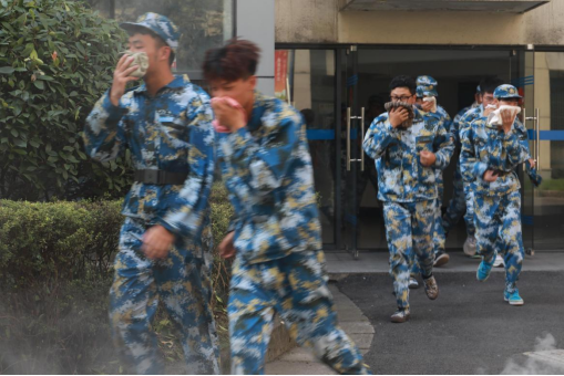 在演练过程中,随着警报声响起,在工作人员的引导下,参加演练的师生们按照演练方案预先设定的疏散路线和规定要求,用毛巾捂住口鼻,以低姿快速、有序地从各个安全出口进行疏散撤离,迅速到达指定地点集中。之后,学生在运动场分别进行了消防水带、灭火器使用演练和观摩。