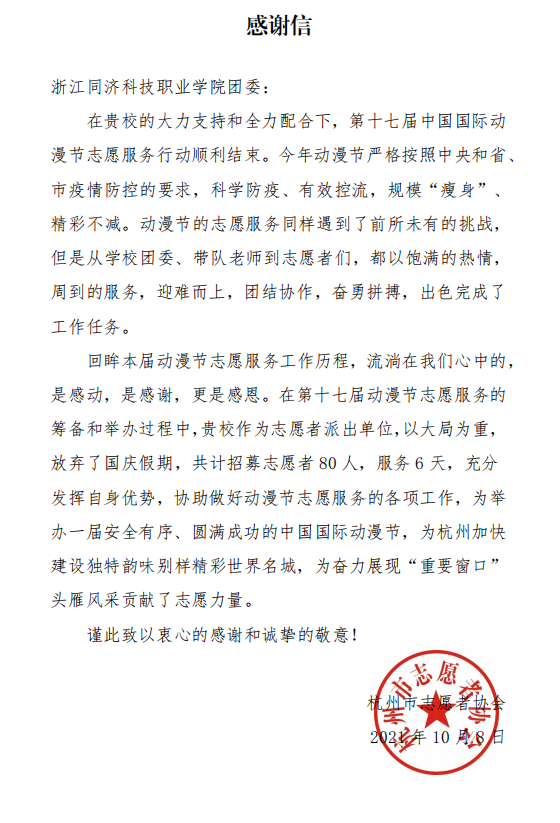 日前,杭州志愿者协会代表第十七届中国国际动漫节组委会向我校发来感谢信,信中对我校全体志愿者的辛苦付出表达了谢意,对我校认真组织做好志愿者工作表示敬意。2021年10月4日,为期六天的第十七届中国国际动漫节在杭州白马湖圆满落幕,来自56个国家和地区的335家中外企业机构、4000多名专业人士通过线上线下方式参与了各项活动,有1300万人次的观众以线上线下方式参与了动漫节的各项互动活动,推动了国内外文化产业跨越式发展和融合。