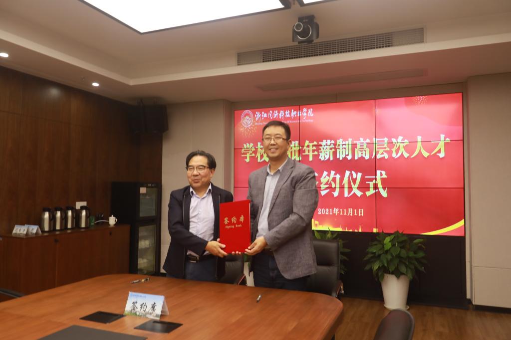 学校人事处处长胡恩保介绍了学校年薪制高层次人才文件出台的背景和遴选过程,并详细解读了《高层次人才协议书》中的考核目标和具体要求。校党委副书记、校长梁国钱与6位教师逐一签订协议。