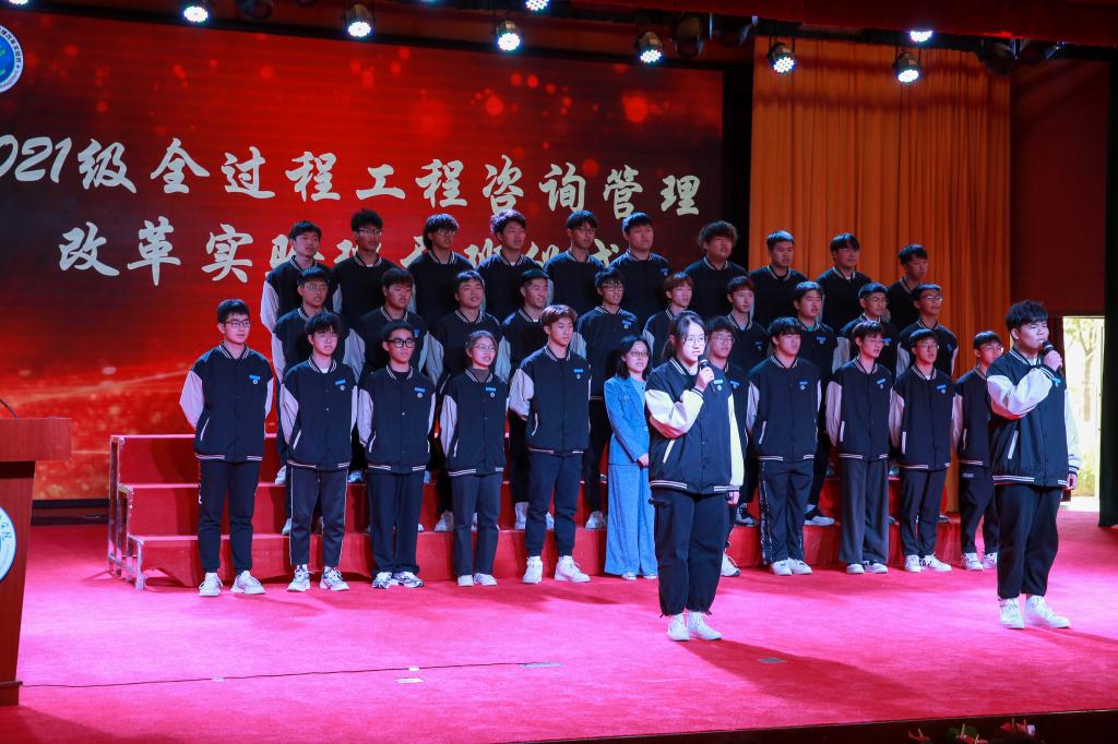 典礼以21工改班32位学子高唱的《骄傲的少年》拉开序幕。朱兆平致辞。他热烈祝贺2021全过程工程咨询管理改革实验班的新生加入这个大家庭,并从学校“厚德”“笃学”“修能”的校训出发,愿同学们努力奋斗,砥砺前行,表示2021全过程工程咨询管理改革实验班可以让校企双方实现优势互补,合作共赢。五洲管理学院副院长黄益专,介绍了五洲公司的业务范围和优势,说明校企合作的优势是提供平台、机遇并履行社会责任,培养符合社会要求的复合型技术人才,助力学生发展。同时希望新生以上一届优秀的学长学姐为榜样,珍惜时光,不负期望,开启新篇章,踏上新台阶。