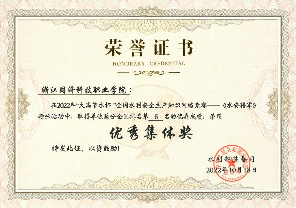 近日,水利部办公厅印发《关于公布2022年安全生产法知识网络答题活动和全国水利安全生产知识网络竞赛获奖名单的通知》,我校以全国排名第6名、全省排名第1名成绩被水利部办公室厅授予“优秀集体奖”。