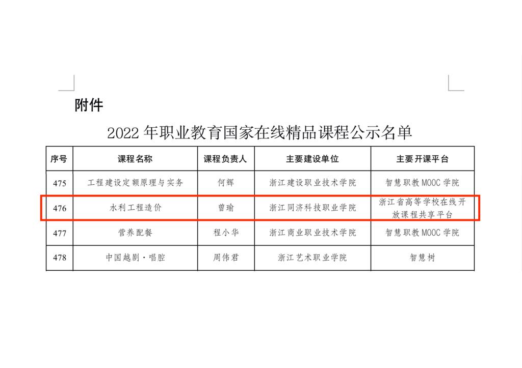 近日,中华人民共和国教育部公布“2022年职业教育国家在线精品课程推荐公示名单”,我校水利工程学院曾瑜教授主持的《水利工程造价》课程成功入围。这标志着我校在课程教学资源建设上取得新的突破,在“双高”专业群建设获得又一个标志性成果。
