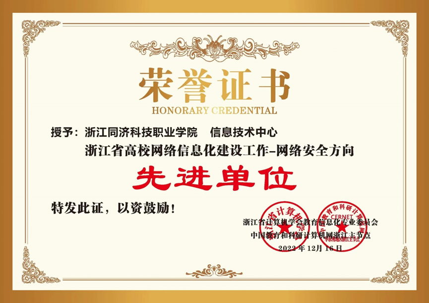 近日,浙江省计算机学会教育信息化专业委员会、中国教育和科研计算机网浙江主节点联合表彰了一批高校网络信息化建设先进单位和先进个人。我校喜获“2022年浙江省高校网络信息化建设工作先进单位——智慧校园建设方向”、“2022年浙江省高校网络信息化建设先进单位--网络安全方向”两项荣誉,王昌云荣获“浙江省高校网络信息化建设工作先进个人”。