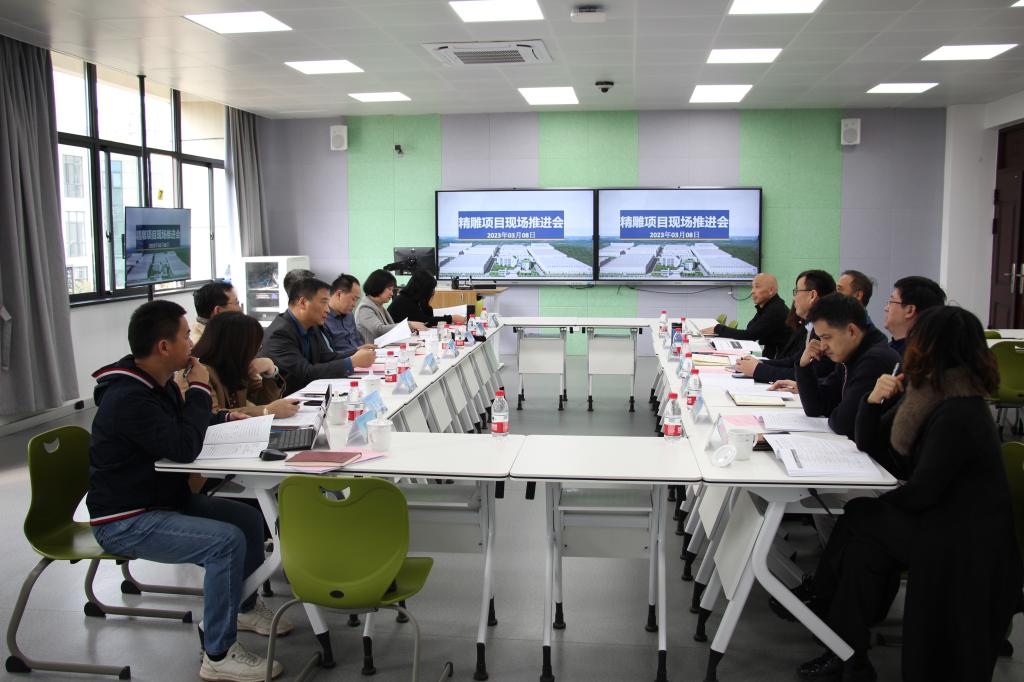 王校长一行首先对机械制造实训中心进行现场调研。机电工程学院院长金永琪就项目开展情况、存在的问题、下一步工作计划做了全面汇报。与会人员就项目推进过程中存在的问题和困难进行了深入地交流和探讨。姜伟副校长、朱兆平副校长、吴玲洪部长就如何高质量推进精雕合作项目建设提出了宝贵的意见和建议。