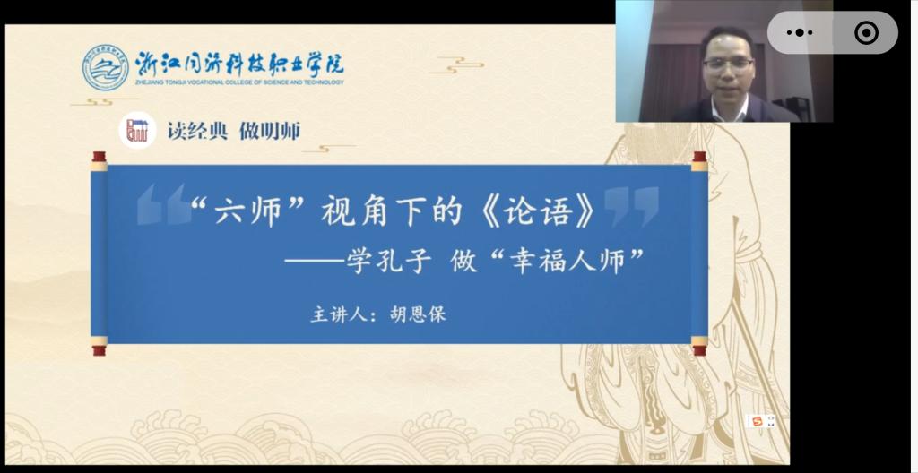 为切实加强学校师德师风建设,落实全省教育系统师德师风问题整治工作视频会议精神,强化正向引领,涵养高尚师德,4月13日,学校依托职教联盟云学院在线上开展了师德师风专题讲座。人事处处长、教师教学发展中心主任胡恩保作《“六师”视角下的论语——学孔子做“幸福人师”》主题报告。校内外3000余人次在线观看了讲座直播。
