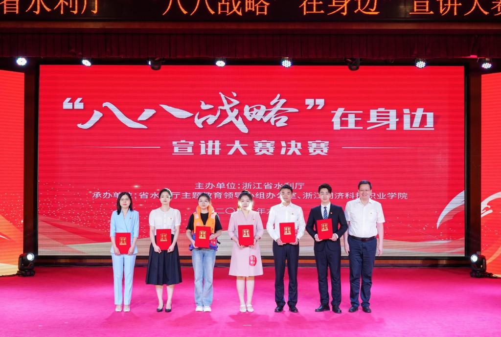 6月25日,由省水利厅主办,省水利厅主题教育办公室与我校联合承办的“‘八八战略’在身边”宣讲大赛决赛在瓯江楼水韵剧场举行。省水利厅党组成员、厅主题教育领导小组副组长张日向致辞,省委主题教育第十一巡回指导组成员、省交通发展研究中心副主任吴坚到场指导。《宣传半月刊》编辑部主任张丽红,省“金马先声”理论宣讲名师工作室负责人、浙江金融职业学院马克思主义学院院长牛涛,浙江广电集团教科影视频道党建节目部主任焦征远,省水利厅直属机关党委专职副书记、厅主题教育办副主任王新辉,省水利信息宣传中心主任邢云担任大赛评委。学校领导张勇、吴宏平、吴玲洪、吴敏启出席活动,来自厅机关处室、厅属单位代表以及我校师生党员到场观摩。