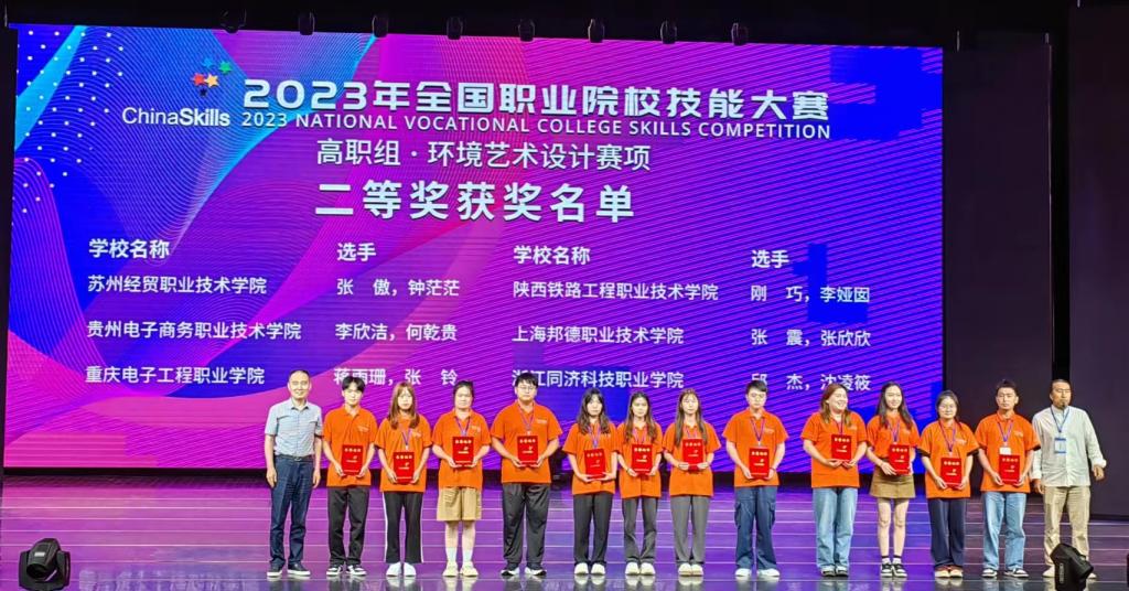 7月22日至25日,2023年全国职业院校技能大赛“环境艺术设计”赛项在苏州工艺美术职业技术学院举行,经过各省省赛的层层选拔,全国共有64队伍参加国赛。由我校艺术设计学院环境艺术设计专业2021级沈凌筱、装饰21级邱杰两人组成的代表队,从全国64支队伍中脱颖而出,荣获大赛二等奖。