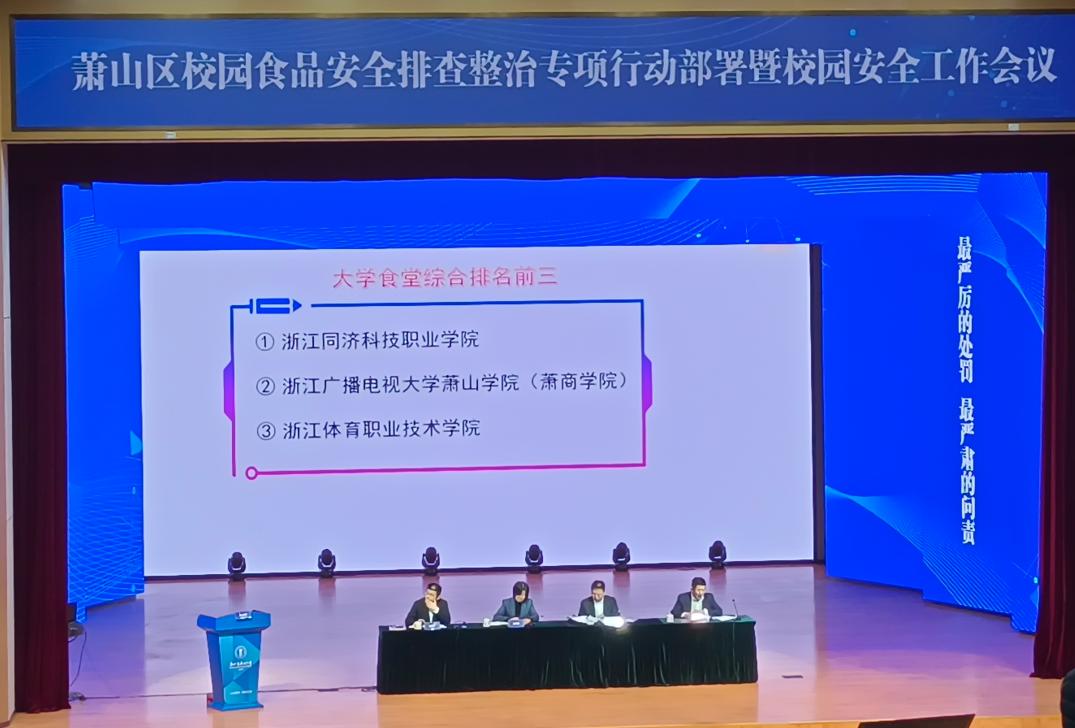 会上,杭州市市场监管局萧山分局发布了2023年度萧山区校园食品安全综合指数测评结果,并表彰了校园食堂经营管理工作突出的学校。我校获评萧山区高校校园食品安全综合指数测评第一名。杭州市市场监管局萧山分局、萧山区教育局就落实国务院、省政府关于全省校园食品安全排查整治专项行动作了各阶段重点工作的部署。