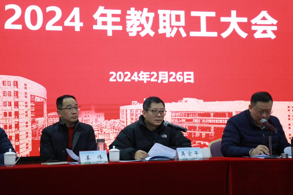 王校长指出,2024年是中华人民共和国成立75周年,是实现“十四五”规划目标的关键一年,也是学校打造高质量发展新增长极至关重要的一年。高职教育发展迎来空前的好形势,做好学校今年各项工作意义重大、使命光荣。2024年,学校工作一是要坚持党的全面领导,筑牢发展政治根基。全面贯彻落实新时代党的建设总要求,旗帜鲜明讲政治,坚持大抓基层鲜明导向,坚持新时代好干部标准,筑牢意识形态防线。二是要聚焦高质量发展,提升关键办学能力。围绕职业教育发展“一体两翼五重点”的战略部署,把服务国家战略、服务区域经济社会发展、服务人的全面发展作为根本目标,通过专业建设、教学改革、师资引育等,切实提升教学质量和关键办学能力。三是要落实立德树人,提升人才培养质量。重点提升思政育人、服务育人、文化育人质量,建设贯通式“三全育人”体系,提升学生发展核心素养。四是要推进开放办学,增强社会服务能力。坚持协同创新,实施“三百一千”工程,探索科教融汇实施路径;坚持育训结合,打开服务产业发展新赛道;夯实合作基础,拓展国际交流空间。五是要优化内部治理,提升办学治校水平。坚持数字赋能,完善体制机制,办好惠民实事。六是要守住安全底线,确保持续健康发展。全力打造平安和谐校园,强化安全底线思维,切实推进校园综合治理;加快实施校园基础设施提质工作,切实提升办学条件;深化清廉建设,打造风清气正廉洁校园,为师生营造安全健康的育人环境。