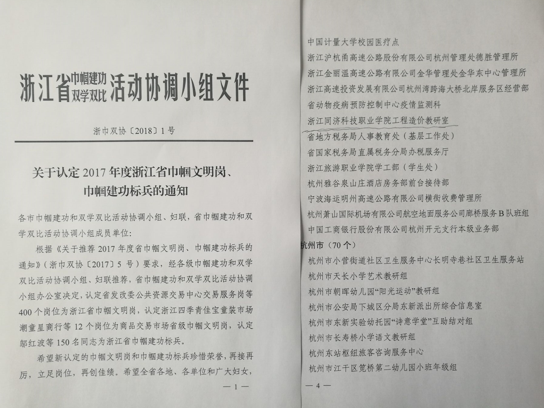 我院工程造价教研室被认定为浙江省“巾帼文明岗”