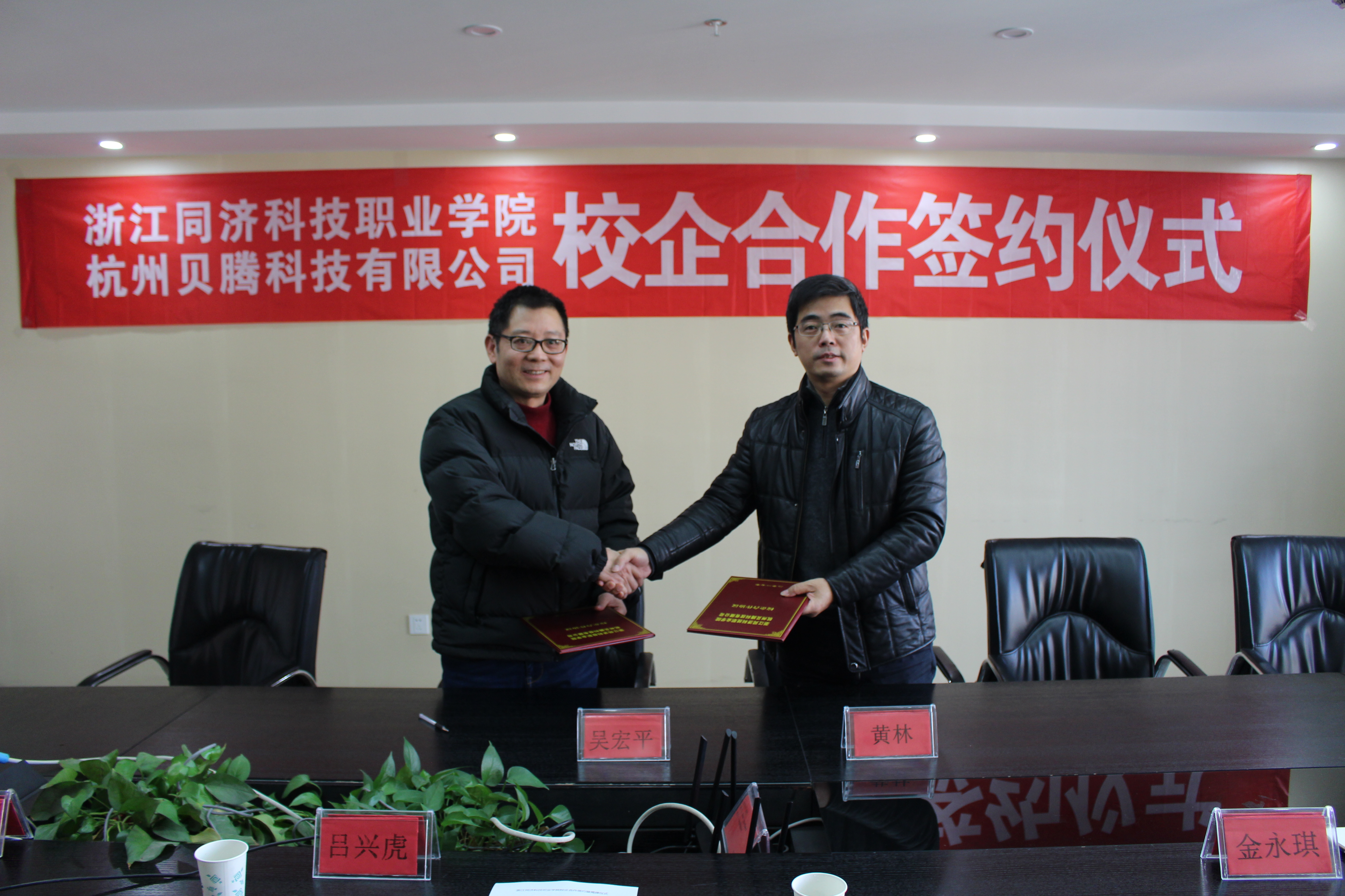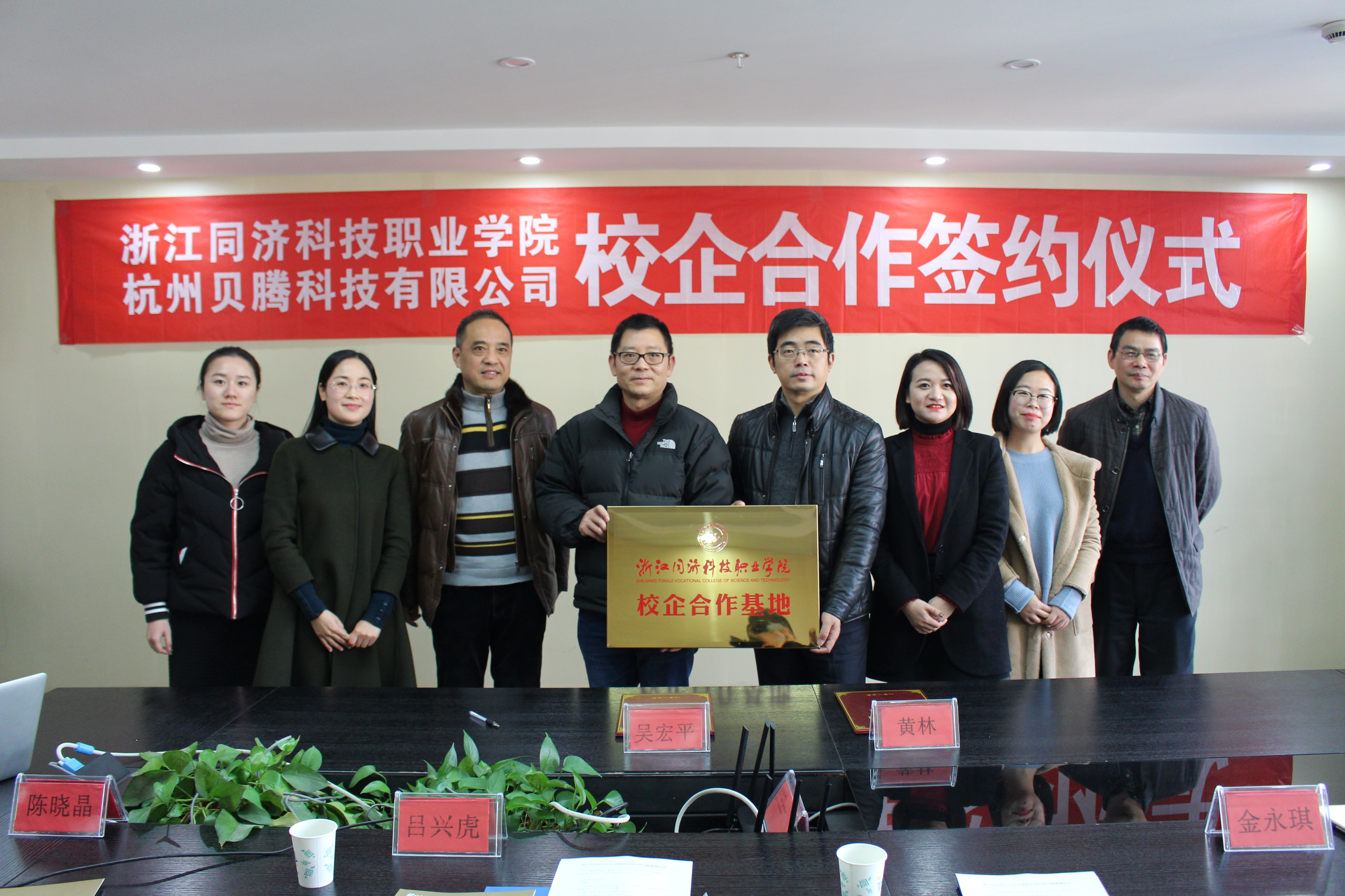 11月19日,学院与杭州贝腾科技有限公司校企合作签约仪式在贝腾杭州总部举行。副院长吴宏平、杭州贝腾科技有限公司总经理黄林,招生与就业指导处处长金永琪、发展合作处处长吕兴虎等领导出席签约仪式。