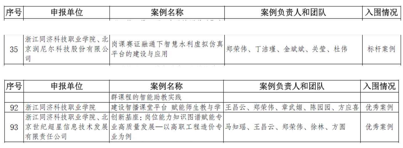 据悉,本次案例征集活动由中国教育技术协会组织开展,覆盖全国31个省份的1000多所院校。经过院校申报、专家论证等环节,确定首批标杆案例107个、优秀案例181个、特色案例311个。其中,浙江省高职院校入围标杆案例5项,优秀案例14项,特色案例5项。