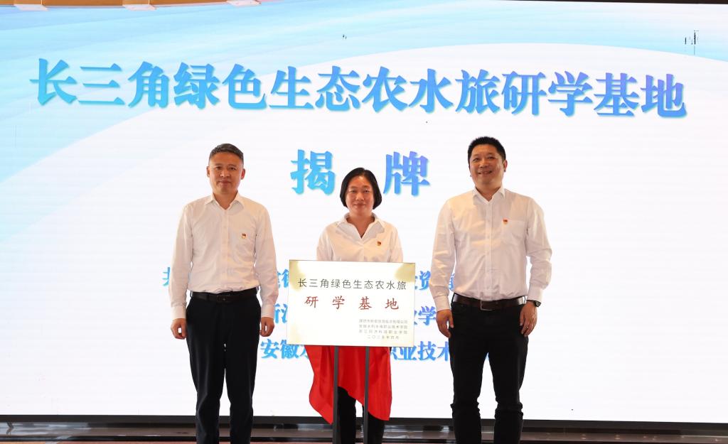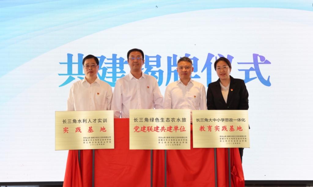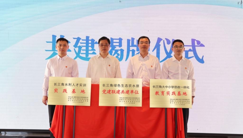 会上,校地企三方代表共同揭牌了水利人才实训实践基地、党建共享基地、大中小学思政一体化教育实践基地、长三角绿色生态农水旅研学基地等多个共建基地,为区域人才共育、党建交流及绿色生态研学提供了新平台。