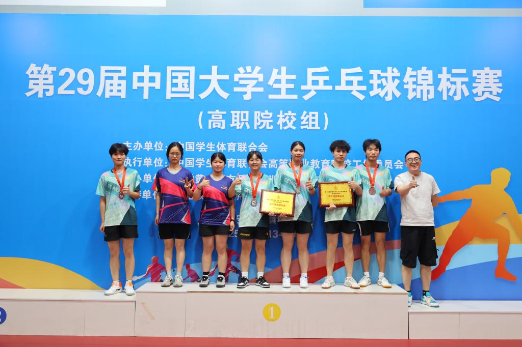近日,第29届中国大学生乒乓球锦标赛(高职高专组)在安徽圆满落幕。学校代表队在校长王卫标的带领下,在王文涛、沈逸的精心指导下,不畏强手、敢打敢拼,最终斩获女子双打一等奖,并夺得男子团体、女子团体、混合双打、男子双打四项二等奖,实现体育国赛一等奖的历史性突破。同时王文涛老师被评为优秀教练员。