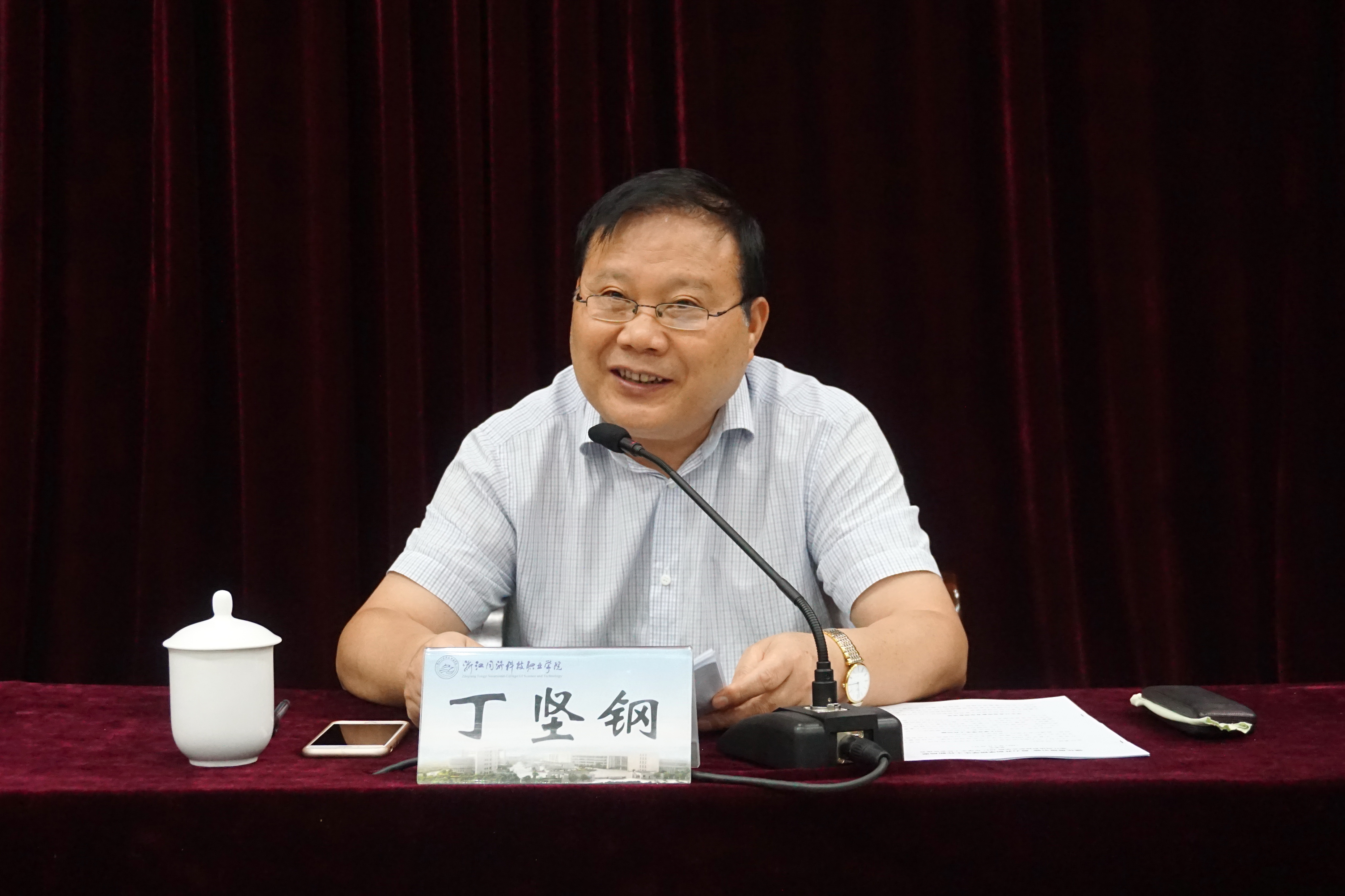 丁坚钢书记讲话,他指出,在省第十四次党代会上,省委明确提出创新强省、人才强省目标,这对我省教育事业,特别是高等教育事业提出了更高的要求。学院也要深入谋划如何进一步提高人才培养质量,在推动经济转型升级,创新驱动发展中提供人才保障和技术支撑,并就此提出了三方面要求:一是要全面落实全国、全省高校思政会议精神和习近平总书记重要讲话,牢牢把握社会主义办学方向,立德树人,抓好思政教育主渠道,落实思政课程向课程思政的转变,要丰富学生第二课堂各项社会实践活动,重视向上向好的校园文化建设,不断提升育人的环境;二是坚持以生为本,争当“四有”之师,做好学生的“四个引路人”,每位教师不但要有扎实学识,也要有过硬的动手操作水平,更要具备一颗仁爱之心,要建立起终身学习,自觉向身边的优秀教师学习的工作思维;三是学生工作要与时俱进,有创新思维,要充分利用好新媒体,和学生建立起良好的互动关系,正确掌握新常态下的学生思想和意识形态,由堵为疏,正面引导,从而实现对学生的全员覆盖、全过程引导和全方位教育目标。