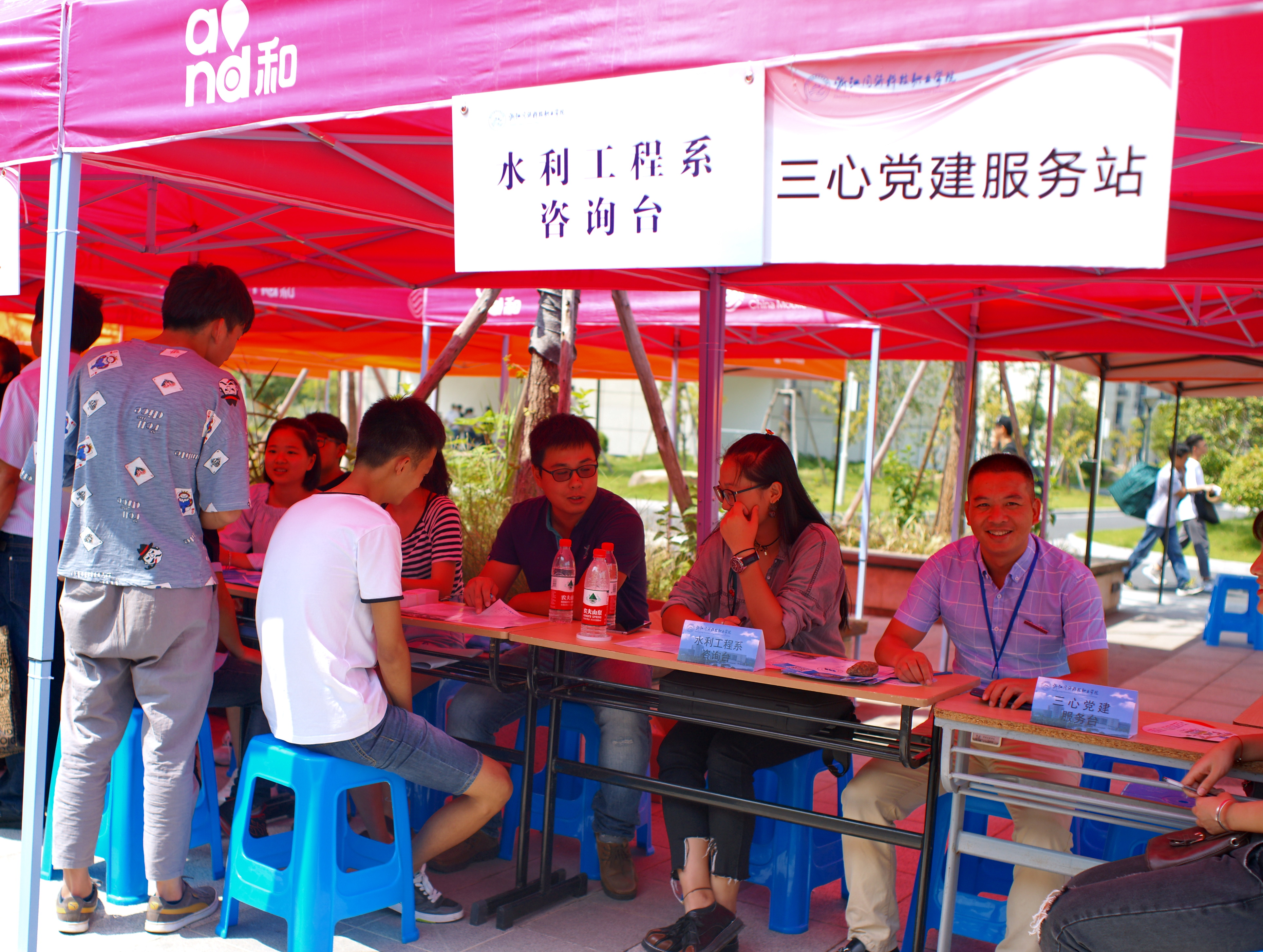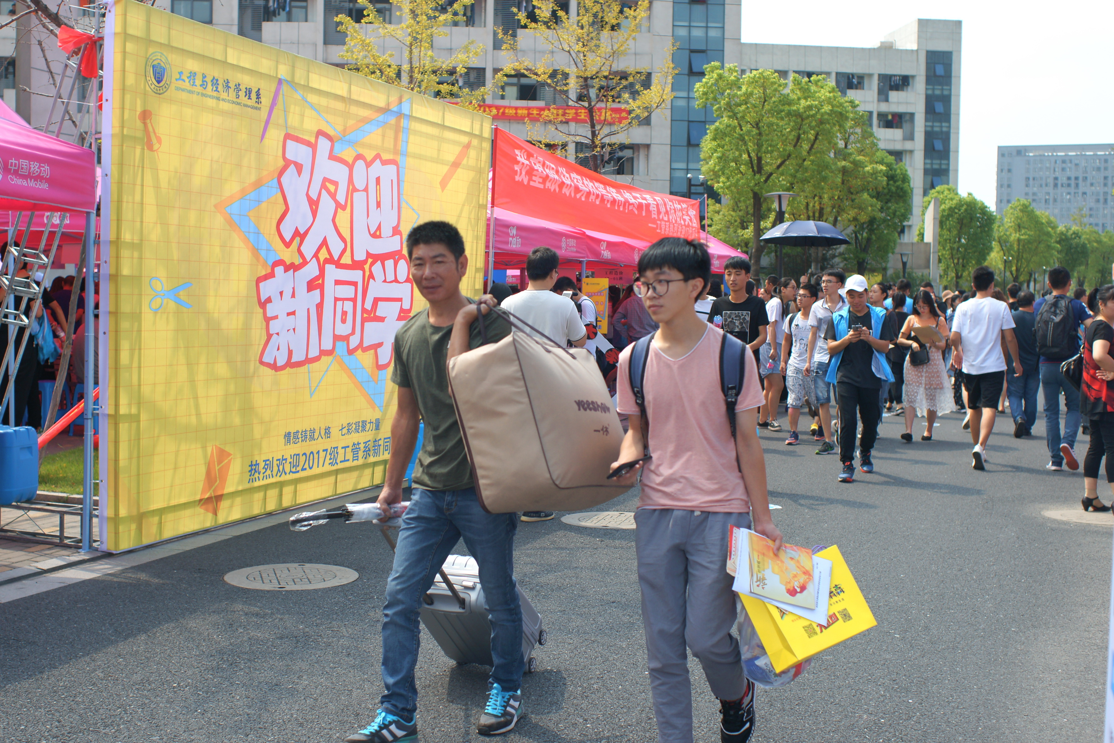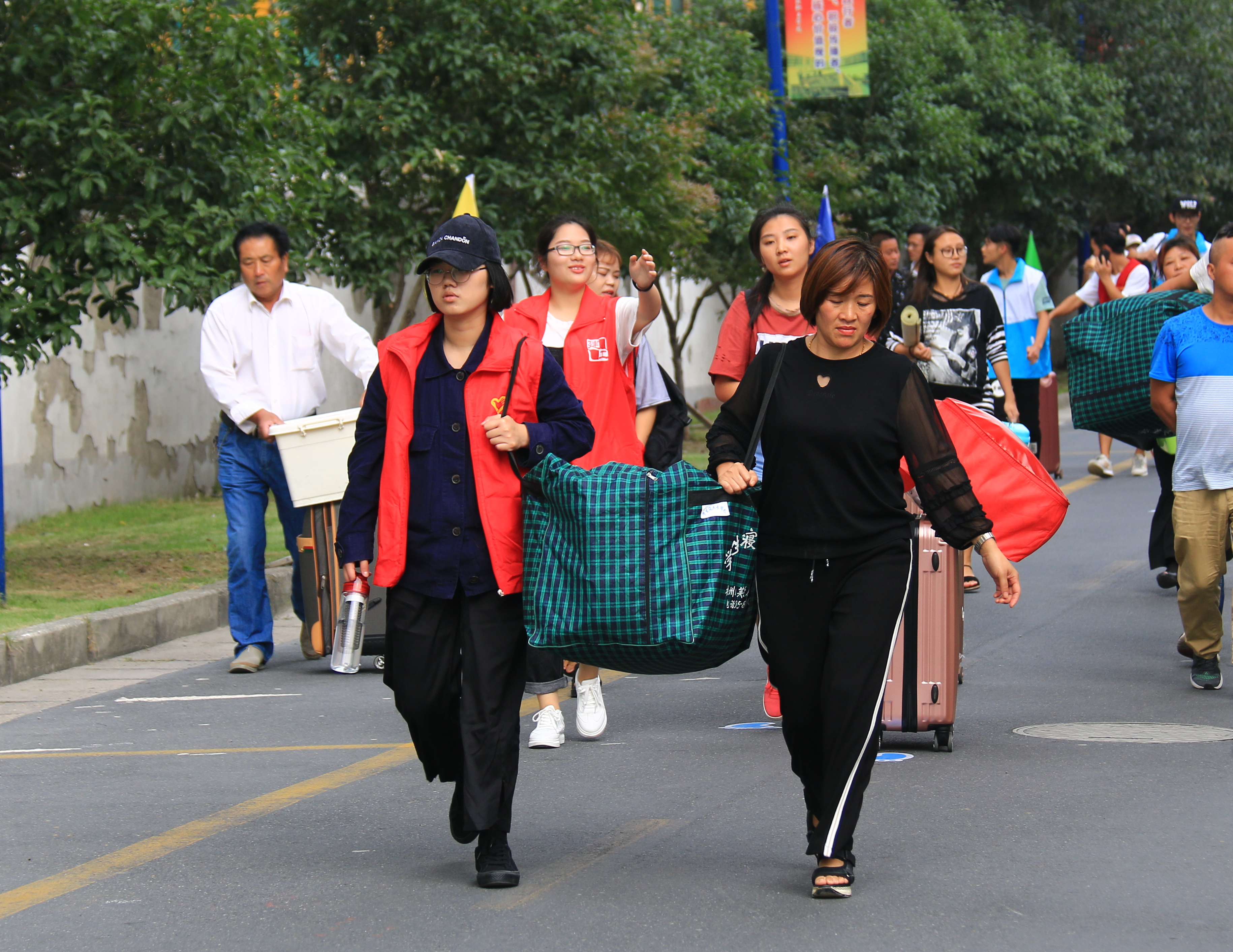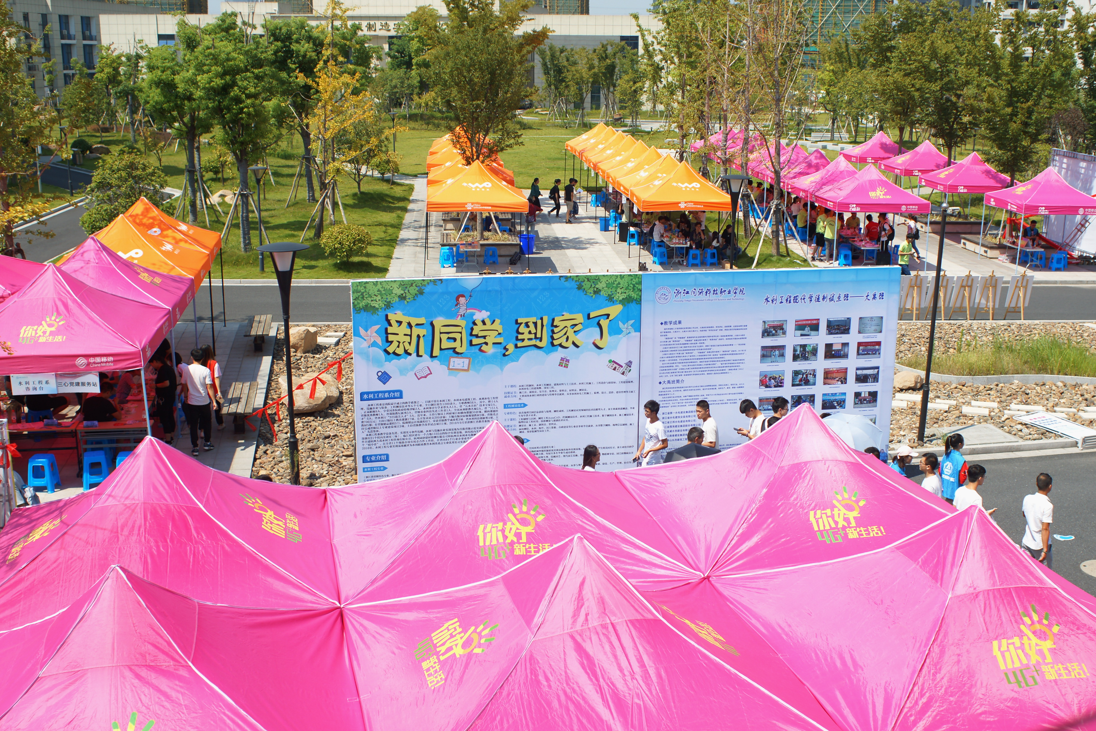 一大早学院门口就已经布置好了迎新的气拱门、横幅,老师和志愿者们都早早等在车站、校门口、校内接待点等各场地准备迎接新生,红马甲的志愿者穿梭校园各处,帮助新生搬运行李,指引方向。整个校园都充满了青春热烈的迎新气氛。在迎新接待点区域,各系的帐篷整齐有致,师生热情地接待新生和家长们,耐心指导他们办理报到手续,并详细回答他们的问题。整个迎新工作进行得有条不紊。