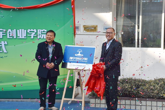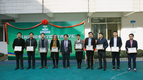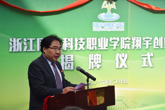 优秀企业家校友代表浙江普莱得电器有限公司总经理杨伟明作为翔宇创业学院副理事长、莱克空间创始人范景彪作为校外创业导师代表分别进行了发言。会上颁发了翔宇创业学院理事和校外创业导师聘书,此次共聘请了各行各业的校外创业导师16人。他们将对入驻创业园的项目进行一对一的指导和不定期给飞翔班的学员进行授课。最后丁坚钢书记和优秀企业家校友代表杨伟明进行了揭牌。