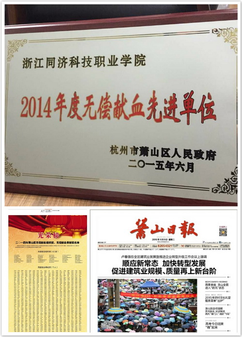 6月11日,由萧山区人民政府主办的庆祝6•14世界献血者日暨2014年度无偿献血表彰大会,在萧山区蓝天宾馆隆重召开。我院喜获2014年度无偿献血先进单位荣誉称号,团委相关人员及部分学生代表参加了表彰大会。