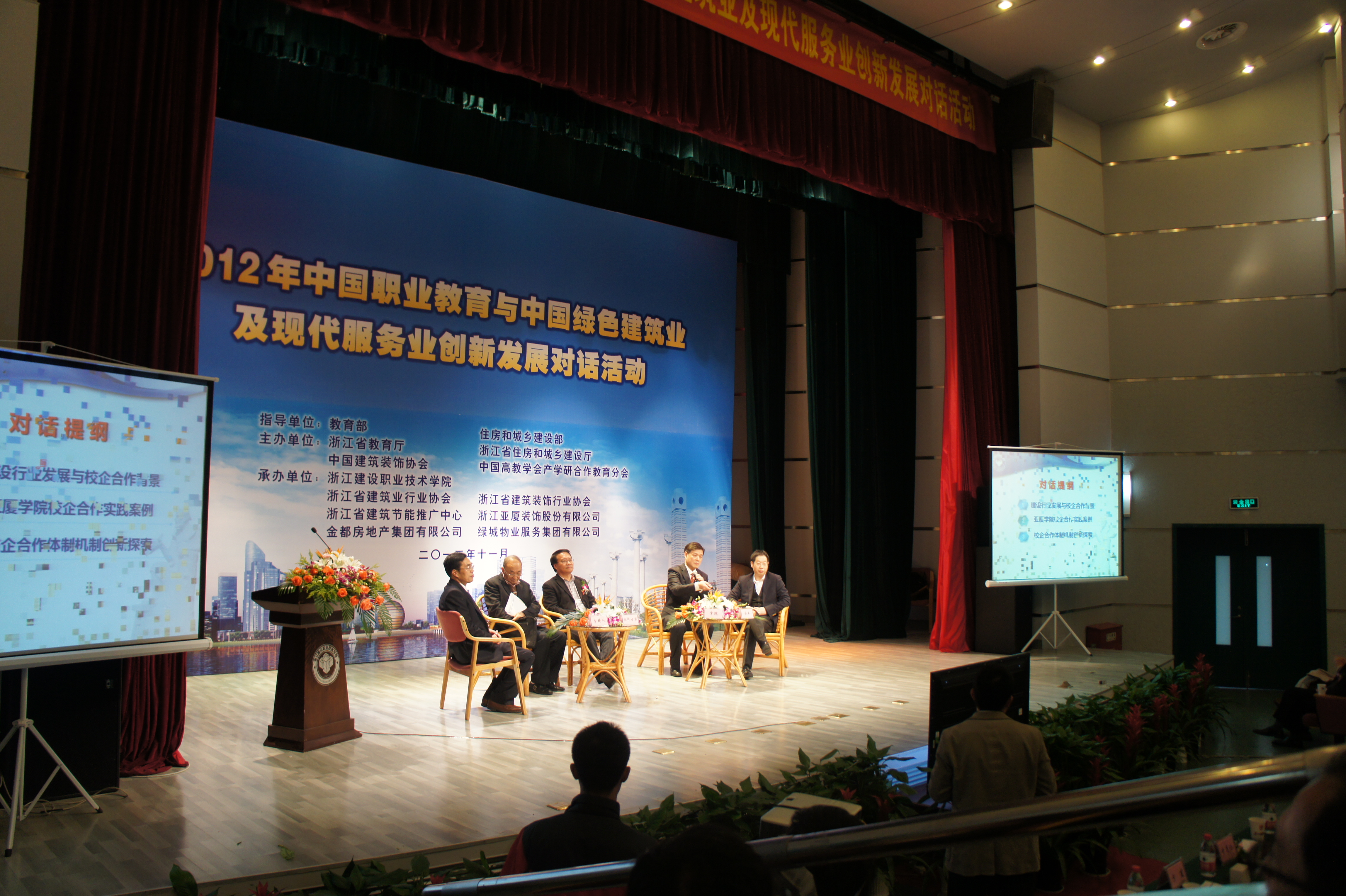 本次对话会由教育部、住房和城乡建设部指导,浙江省教育厅、浙江省住房和城乡建设厅、中国建筑装饰协会、中国高教学会产学研合作教育分会联合主办,浙江建设职业技术学院、浙江亚厦装饰股份有限公司、金都房产集团有限公司等联合承办。对话以“促进绿色建筑产业转型升级,推进现代服务业创新发展”为主题,旨在落实《关于做好2012年职业教育与产业发展对话活动的通知》文件精神,进一步提高建筑业服务业技能型人才的培养质量,拓展建筑行业校企产学研合作新空间。