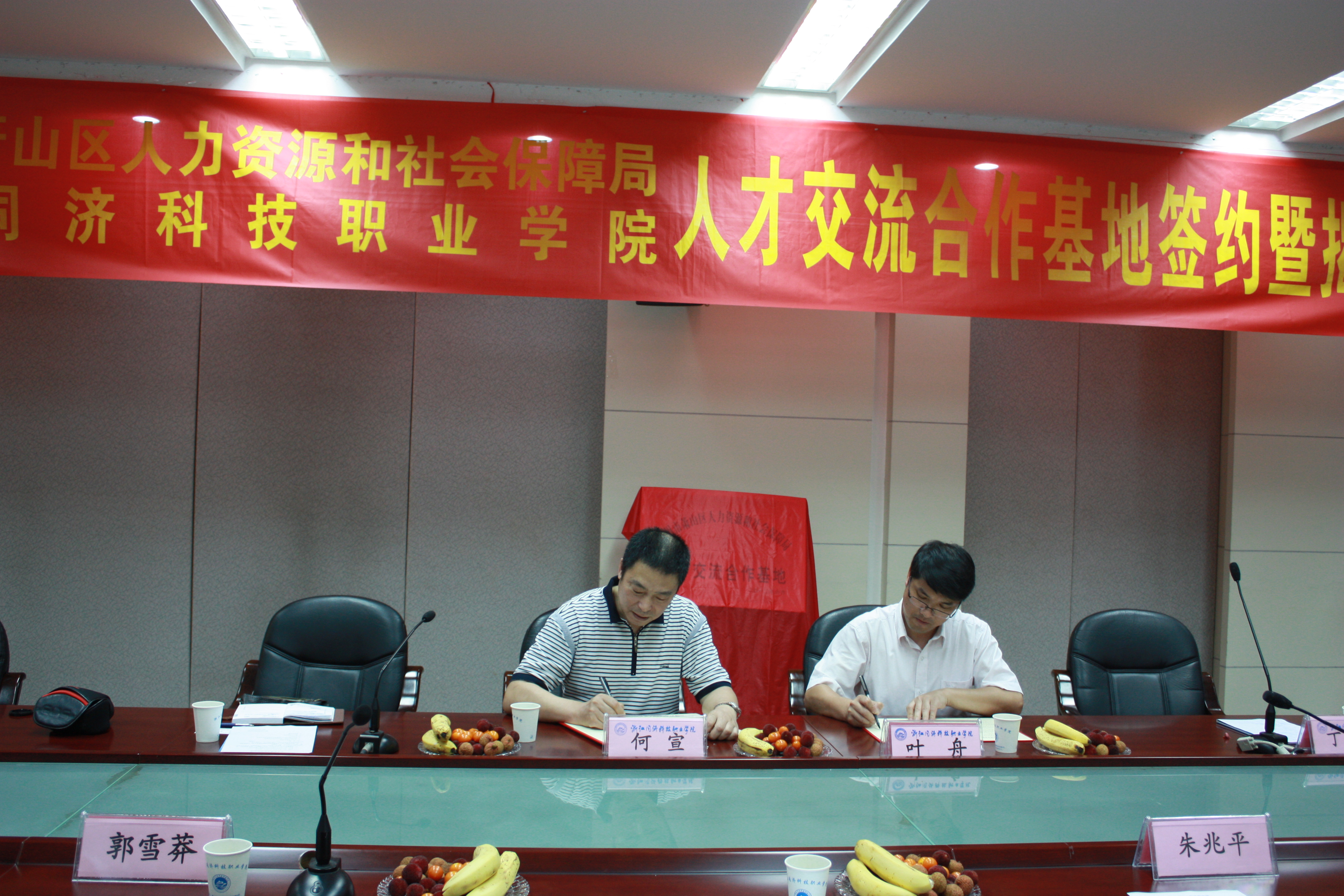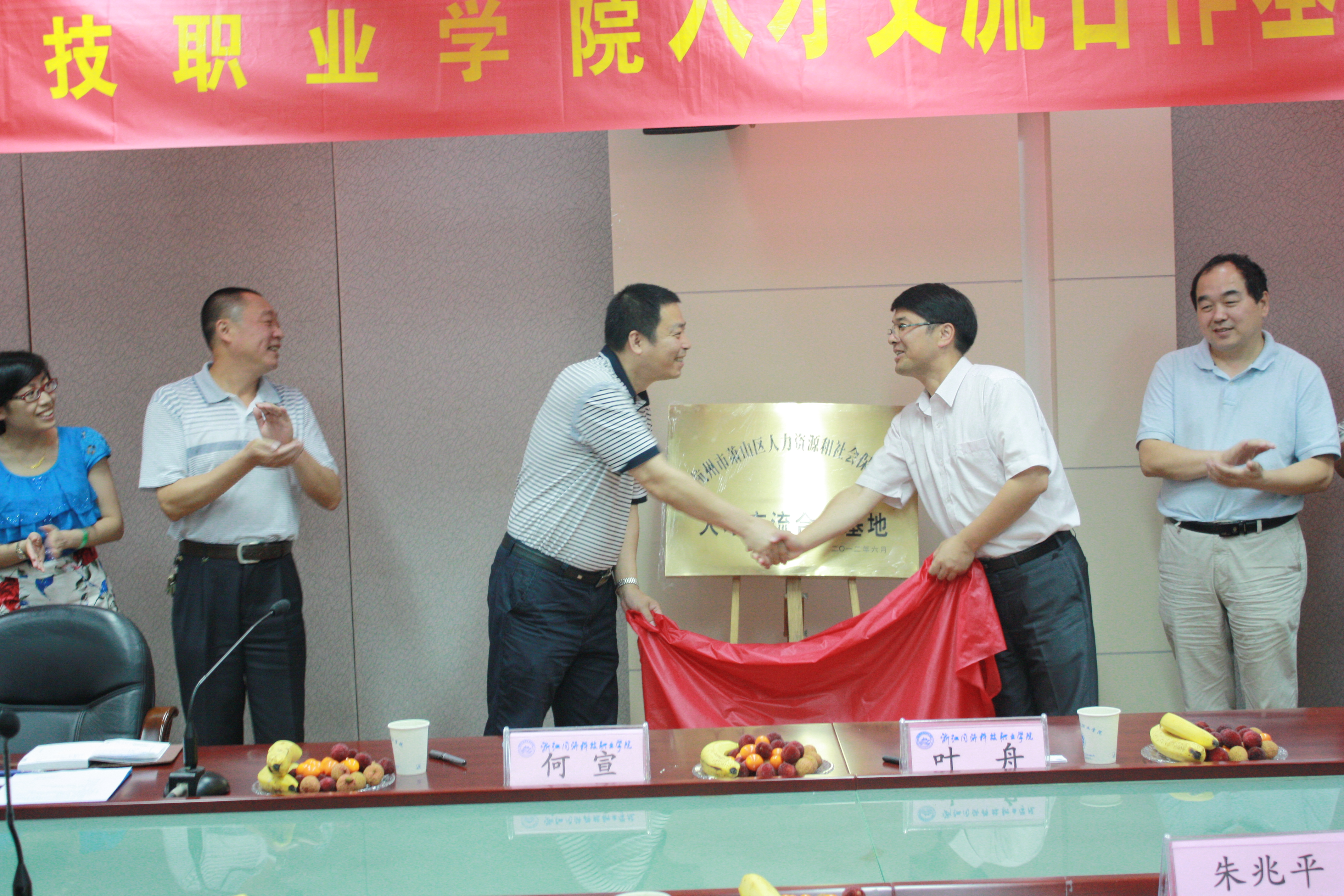 近日,我院与杭州市萧山区人力资源和社会保障局人才交流合作基地签约暨揭牌仪式在学院举行。学院院长叶舟与人保局副局长何宣代表双方在协议上签字并揭牌,此协议的签订,符合高职办学服务区域经济发展的办学理念,形式上由与单一的企业合作上升为和区域合作,这标志着我院在校企合作,工学结合办学模式上迈出重要一步。萧山区人保局人才管理服务处主任洪光、副主任丁珏以及学院副院长郭雪莽、建筑系主任朱兆平、实训中心副主任朱达凯等出席了签约、揭牌仪式。