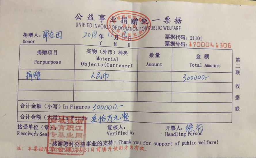 这并不是邵在田老师对学院的第一笔捐款。2015年当得知学院一位学生患病急需治疗费时,八旬高龄的邵老师亲自冒雨赶到学院,把钱交到患病学生的老师手里。作为一名有六十多年党龄的老党员,邵在田老师常说,自己的一切都是党和人民给予的,他所作的也只是回报而已。