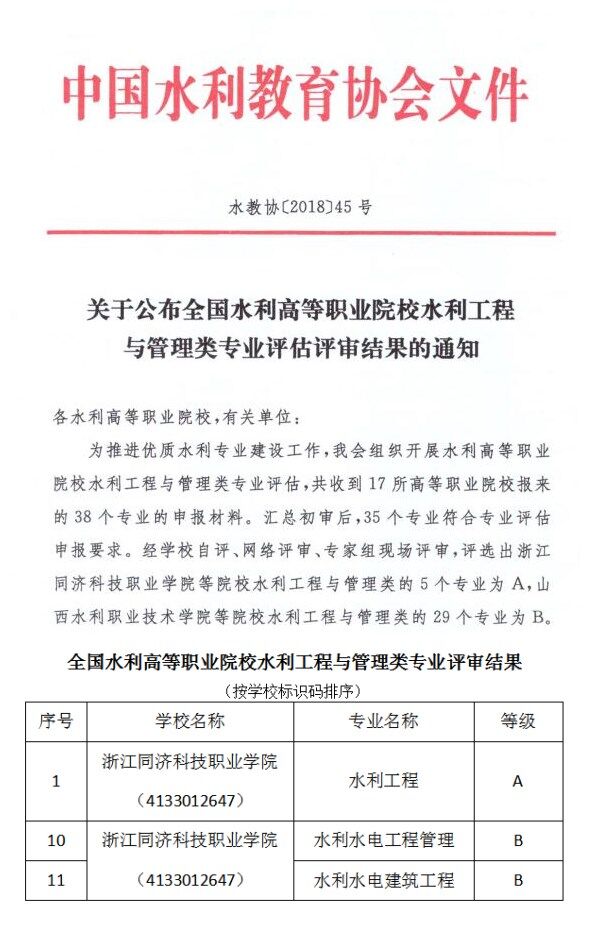 为推进全国优质水利高职院校和优质水利专业建设工作,中国水利教育协会于2018年9月开始组织开展全国水利类专业评估工作,要求各高职院校结合本校实际,选择水利工程与管理类(5502)专业中优势专业及全国优质水利专业建设点参与评估。经各院校自评、网络评审、专家组现场评审三个环节,最终从全国17所高等职业院校的38个参评专业中评选出5个A等级专业,29个B等级专业。