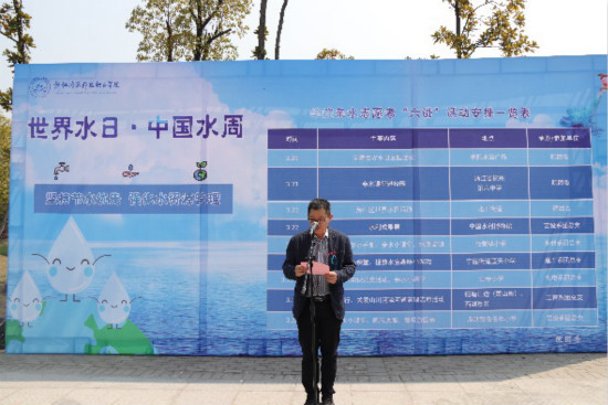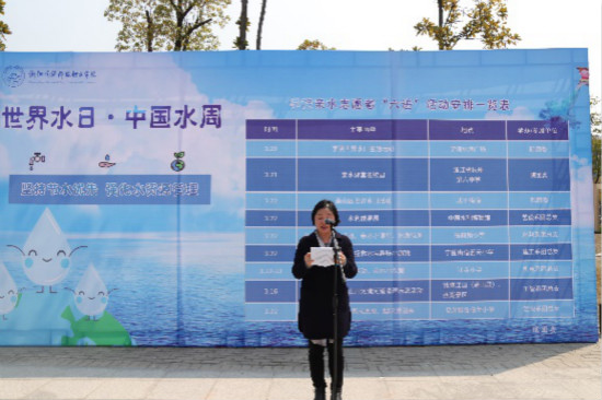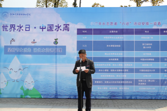 吴宏平副书记讲话。他指出浙江因水而名、因水而生,因水而兴、因水而美。当前省委省政府积极践行新时期治水方针,以治水为突破口加快推进产业转型升级,实施乡村振兴战略,加快建设安全流畅、生态健康、水清景美、人文彰显、管护高效、人水和谐的具有诗画江南韵味的美丽浙江。他强调,学院作为浙江省唯一一所水利类高等职业院校,始终坚定不移地把服务我省水利事业发展纳入到学院办学治学的方方面面,亲水文化和亲水实践已经成为了校园文化的重要组成部分,学院有责任、有义务、有能力把水利政策、水利科普知识和水利发展史向广大群众宣传好,解读好,引导好。他希望广大师生要积极发挥行业专业优势,做节水护水事业的倡导者;积极履行自我主体责任,做节水护水事业的践行者;要积极承担社会公民职责,做节水护水事业的监督者。
