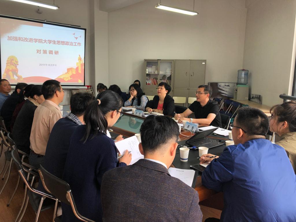 为深入推进“不忘初心、牢记使命”主题教育,10月9日,学院党委书记江影主要围绕“加强和改进学院大学生思想政治工作对策研究”的调研主题,深入思政部开展专题调研。党委委员、宣传部部长吴敏启等参与座谈调研。