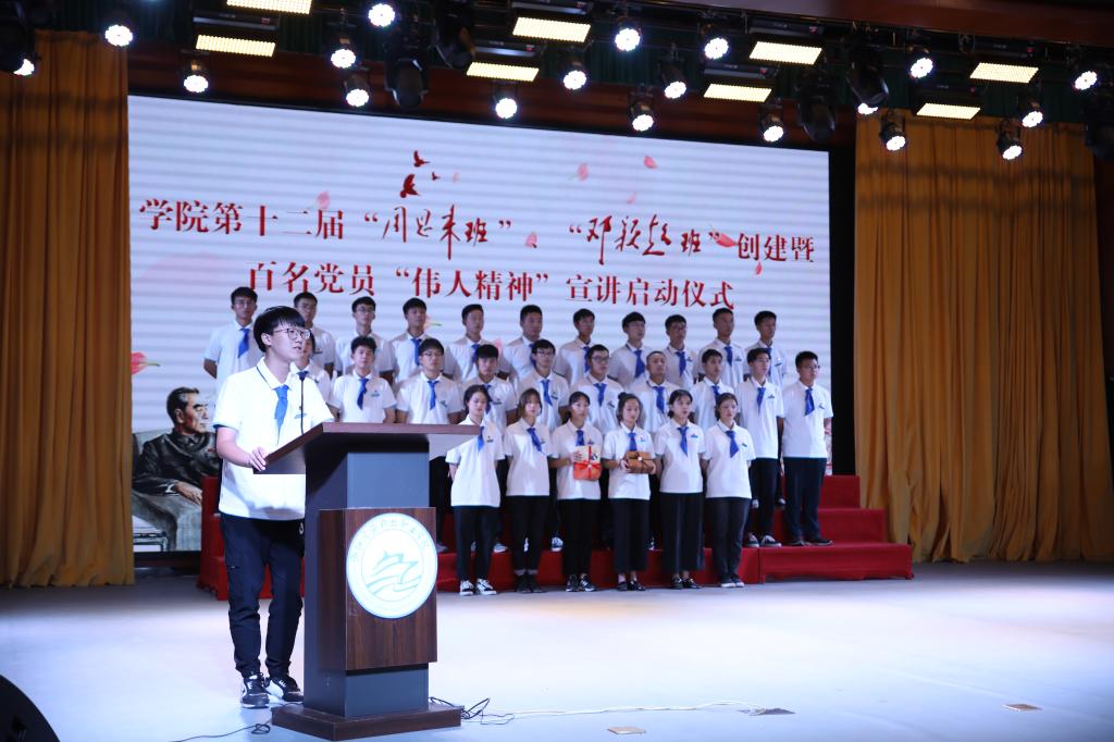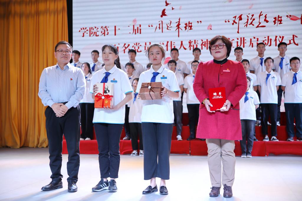 在庄严的国歌后,学院获命名班级第十届“周恩来班”班主任杨昭敏和第十届“邓颖超班”班长周冯斌先后分享了班级创建历程和工作成效。学院党委委员、副院长沈自力宣读了“周恩来班”、“邓颖超班”创建工作研究会学生分会学院“翔宇”骨干精英学校第六期班主任和学员名单,并向他们颁发了聘书、徽章,赠送了《青马工程培训》用书。同时为保障学院第十二届“周恩来班”、“邓颖超班”创建工作顺利开展,发挥全院教师党员育人主体作用,学院党委副书记、副院长吴宏平对百名党员“伟人精神”宣讲工作进行了动员部署,要求德育导师、班主任、辅导员深入班级,贴近学生,切实做到“三个讲清楚”,讲清楚伟人精神是什么,讲清楚习近平总书记在周总理诞辰120周年讲话中总结的六个“杰出楷模”伟人精神,讲清楚弘扬伟人精神的重要意义,讲清楚“周恩来班”、“邓颖超班”的创建活动具体做法。