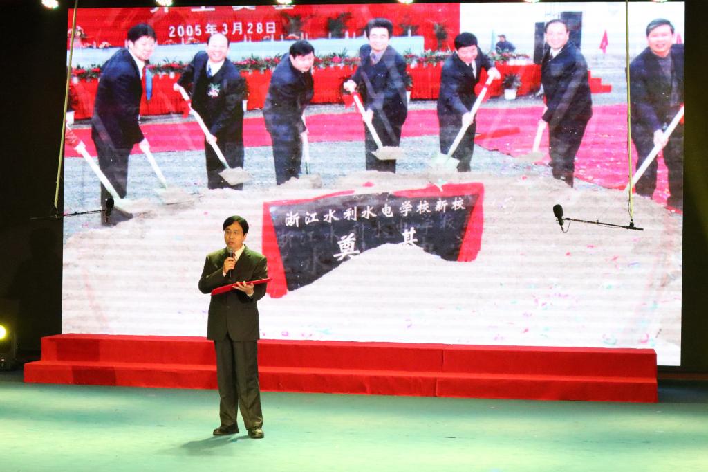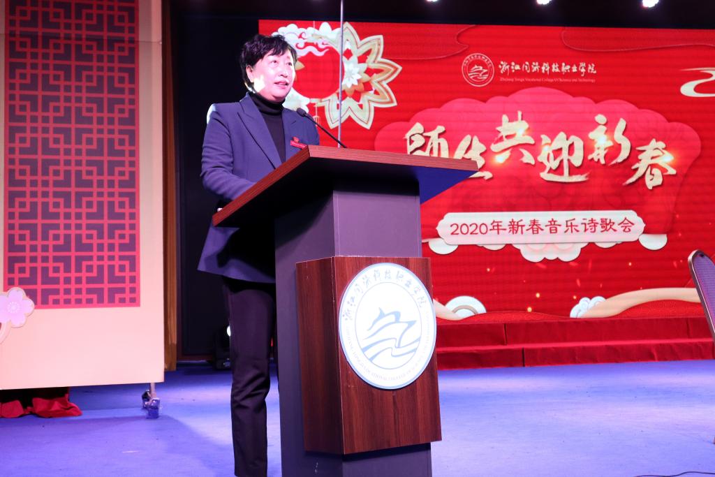 学院党委书记江影致辞。她首先向广大师生致以节日的问候和祝福。她指出,即将过去的2019年,是新中国成立70周年,也是学院建校60周年,在这一年里,广大师生凝心聚力、同心同德,胜利召开了学院第二届党代会,深入开展了“不忘初心、牢记使命”主题教育,成功举办了60周年校庆暨全国水利教育德育论坛,全面推进了学院南浔产教融合基地建设,获得了一些在思政教育、校园文化重要成果,办成了一些实事和难事,增强了师生的幸福感、获得感。她强调,当前高职教育发展有了新的机遇和新的挑战,我们必须以永不懈怠的精神状态和一往无前的奋斗姿态,在2020年继续朝着既定的目标奋勇前进,为学院改革发展再立新功。
