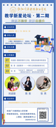 为进一步提升在线教学能力,更好地适应师生返校后线上线下混合式教学模式,4月27日下午,人事处(教师发展中心)组织举办第二期教学新星论坛。学院党委委员、副院长朱兆平教授、教务处(国际交流中心)、教学督导评价中心、人事处相关人员及百余名教师以云端在线的方式参加论坛。