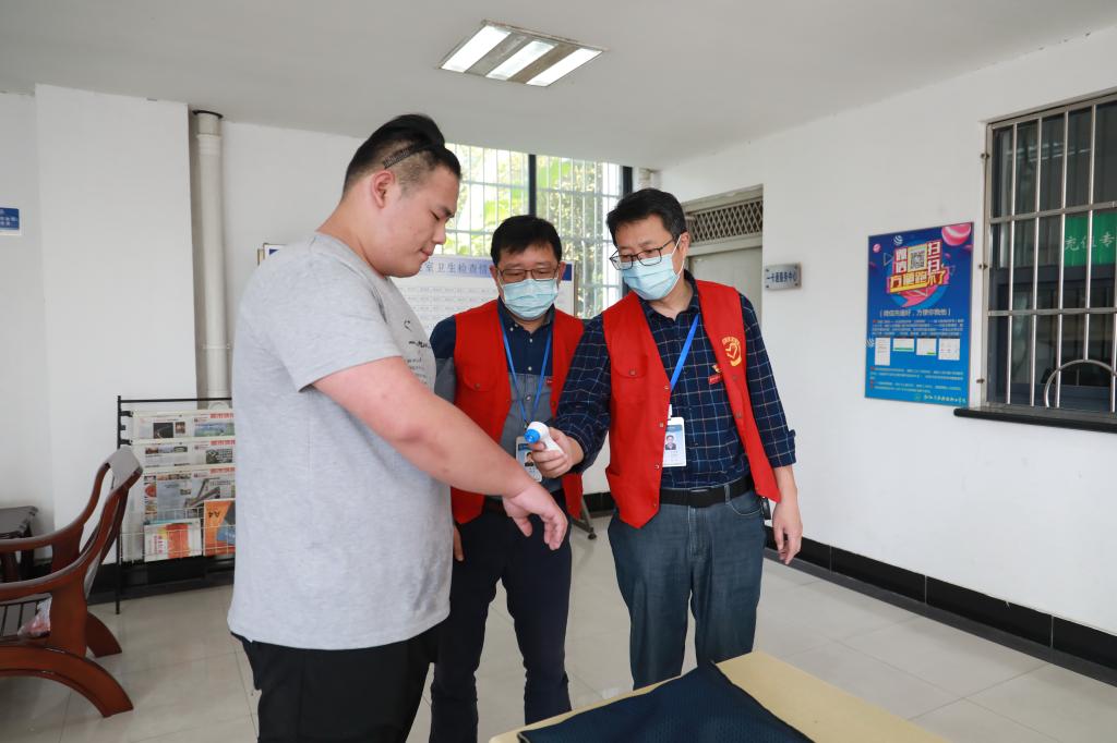 负责食堂就餐秩序维护岗的党员志愿者们,引导学生戴好口罩,排队购餐,减少聚集;公寓楼引导岗的党员干部志愿者们及时补位,对体温监测异常的学生进行二次测温,输入数据录入系统,为学生安全返校复学和校园安全稳定保驾护航。