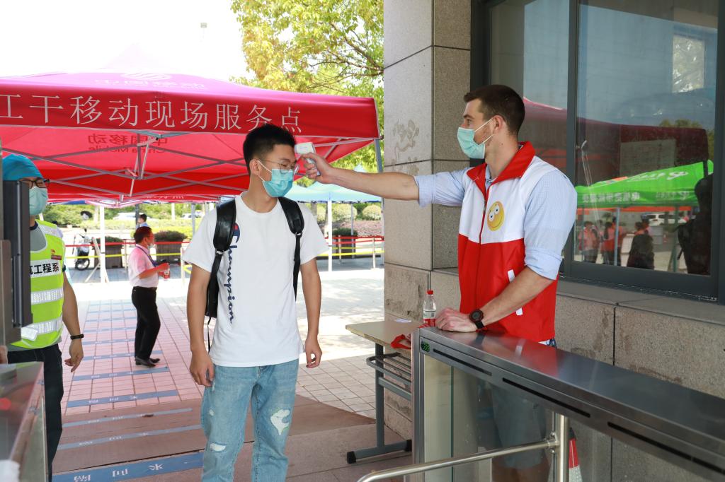 校园门口,负责交通秩序保障岗的党员教职工们也早早到岗。复学第一天,学校及周边人流、车流量较大,30名党员志愿者们分成7组进行维持交通秩序,防止车辆堵塞。引导护送学生的私家车即停即走,引导进校车辆按照校园临时交通标识通行,引导临时停放车辆有序停放,同时专人引导学生到等待区,在进行身份核查、体温监测后有序进校。遇到随身行李较多的学生,各系志愿者立刻迎上去,手提肩扛或是手拉推车帮忙学生搬运行李,护送同学们平安入校,让同学们感受到回家的温暖。