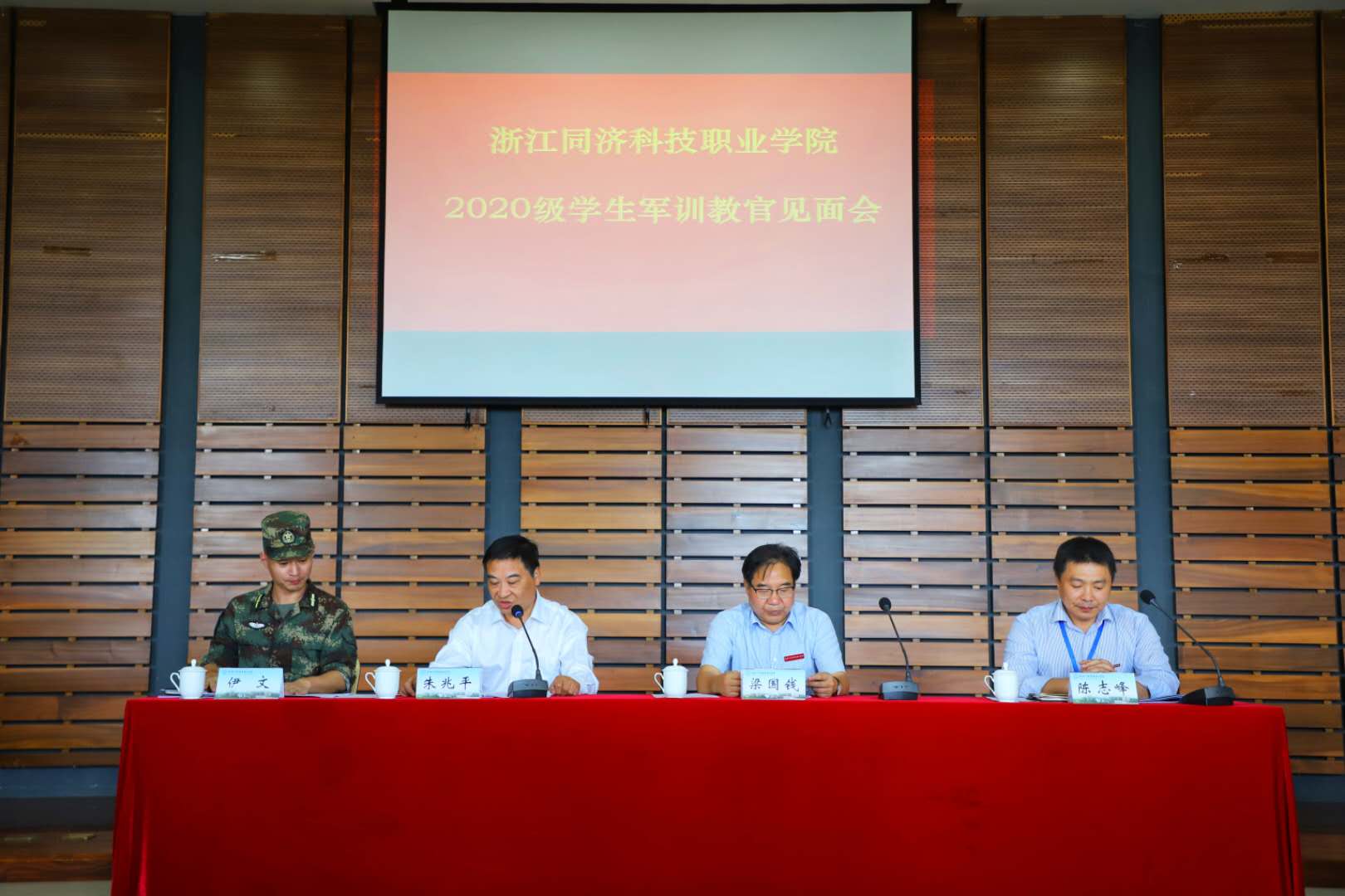 10月14日下午14点,学院2020级新生军训教官见面会在行政楼三楼多功能厅召开。梁国钱院长、浙江建设职业技术学院士官学院陈志峰院长出席,朱兆平副院长主持会议。