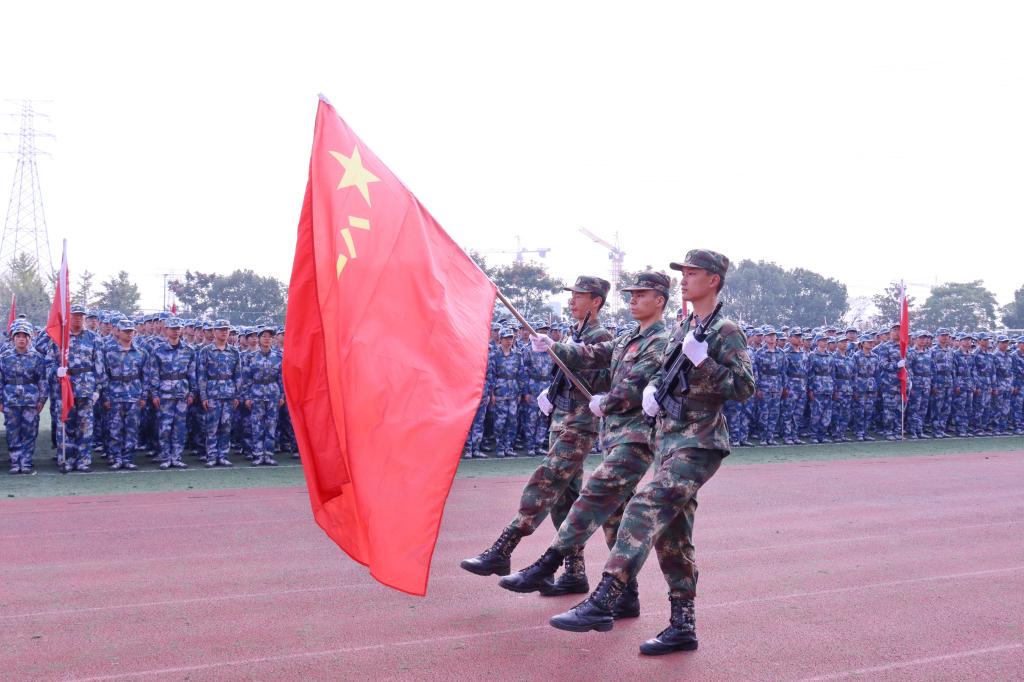 上午9点,伴随着庄严国歌,五星红旗在同科校园中冉冉升起,结业典礼正式拉开帷幕。军训方队在接受院长梁国钱的检阅后,进行分列式表演。五个方阵迈着自信矫健的步伐,呼喊着铿锵有力的口号,雄赳赳气昂昂地经过主席台。他们英姿飒爽、足下有音,动作规范、斗志昂扬,展现了新时代同科学子饱满的精神风貌和顽强的意志品格。紧接着,军事技能表演开始。旗语表演,整齐划一、气势磅礴。枪械表演、军体拳表演,队员身形矫健、拳脚敏捷。汇报表演获得了在场师生的阵阵掌声。