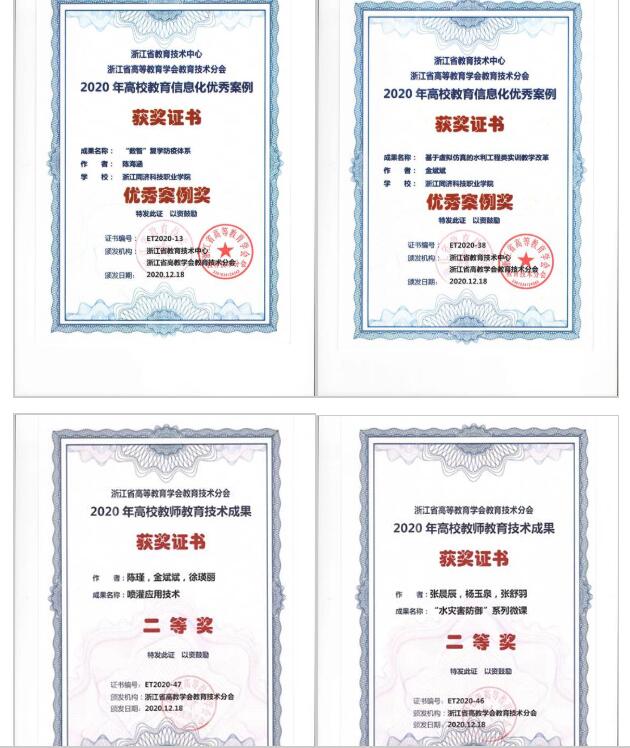 会议表彰了在2020年信息化建设工作中取得优异成绩的单位和个人,学院荣获“浙江省高校网络信息化建设工作先进单位”称号,水利系《基于虚拟仿真实训的水利工程类实训教学改革》、现教中心《“数智”复学防疫体系》两个案例获2020年浙江省高校教育信息化优秀案例奖,张晨辰、陈瑾等老师分获高校教师教育技术成果二等奖,缪莉、刘述丽等四位老师分获四个高校教师教育技术成果三等奖。全省共有9所高校获教师教育技术成果评比“优秀组织奖”,学院位列其中。