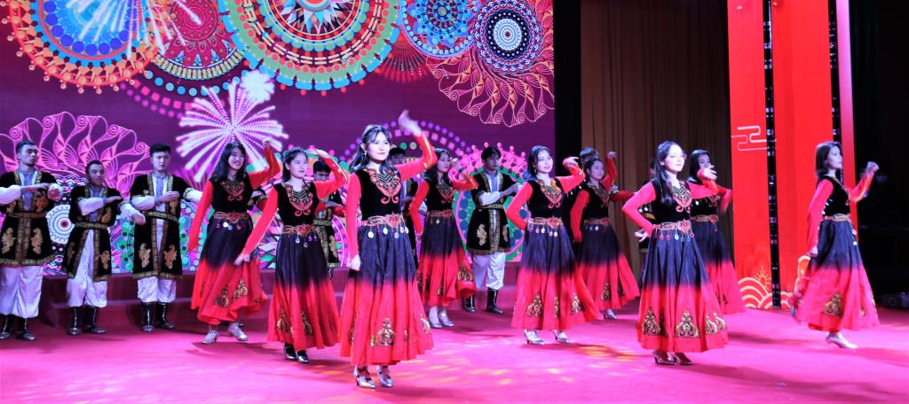 晚会现场共分为同心筑梦、同德奋进、开创未来三个篇章。第一篇章由民族生代表选送的《手拉手,心连心》拉开帷幕,随后在小组唱《夜空中最亮的星》、古风女子舞《繁花》和男子唱《红日》等节目后,学院领导为2020年度学生荣誉之星、十佳大学生及国家奖学金获得者进行了颁奖。晚会第二篇章在催人泪下的舞台剧《抗疫》开始,随后《岁月》《武之风》《雷人舞4.0》和《桃花朵朵开》等节目精彩上演,在热烈的掌声中,张日向、江影等领导为年度教师教学之星、优秀教学团队进行了献花和颁奖。第三篇章主要演出节目先后由《光遇》《神曲2020》《潮涌》等组成,最后由来自艺设系的著名畲族民歌非遗传承人——青年歌唱艺术家兰兰演绎的畲族民歌《彩带献北京》,向同科学子们展现了民族艺术的独特魅力。晚会最后,全体嘉宾领导上台和师生合唱《走在大路上》,将晚会气氛推向高潮。
