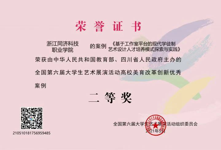 5月12日晚,由教育部和四川省人民政府主办的全国第六届大学生艺术展演活动在四川成都圆满落幕。由浙江省教育厅选送的我校两个项目《橡皮人工作室》艺术工作坊(指导老师:范子珍、戴瑞、李琦)和《基于工作室平台的现代学徒制艺术设计类工作室人才培养模式》美育改革创新优秀案例(指导老师:范子珍、戴瑞、章卉)分别获得大学生艺术实践工作坊一等奖和全国高校美育改革创新优秀案例二等奖。全国大学生艺术展演活动每三年一届,本专科同台竞技,至今已举办六届,这也是我校首次在全国艺术展演活动中获奖,实现了我校在全国大学生艺术展演活动中一等奖零的突破。
