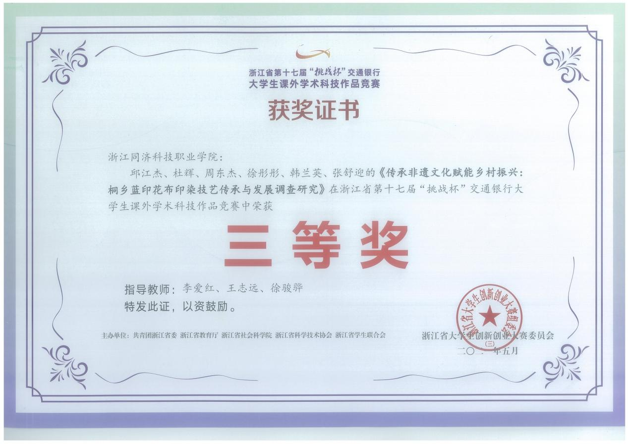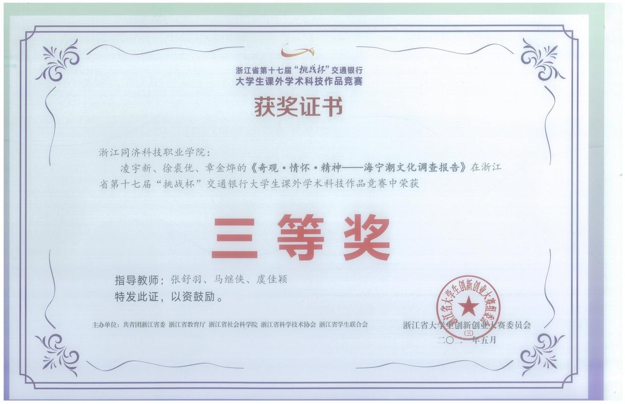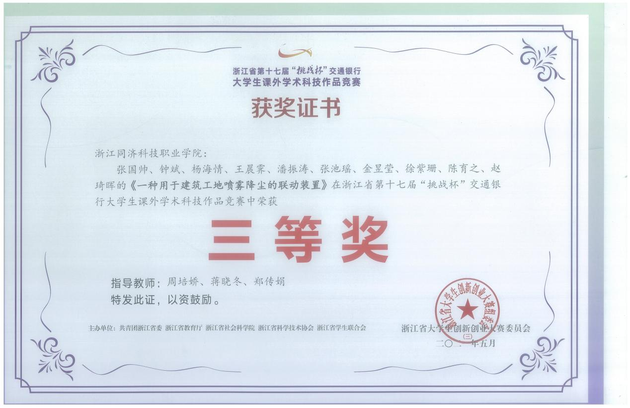 5月14日至16日,由共青团浙江省委、浙江省教育厅、浙江省社会科学院、浙江省科学技术协会、浙江省学生联合会联合主办的浙江省第十七届“挑战杯”交通银行大学生课外学术科技作品竞赛在浙江师范大学举行。学校对本次“挑战杯”大学生课外学术科技作品竞赛十分重视,备赛期间学校党委委员、副校长沈自力等多次组织校团委和二级学院项目组进行模拟答辩和PPT演练,并邀请各级专家进校进行现场和线上指导。经过努力,我校在本届“挑战杯”竞赛中共取得二等奖1项,三等奖6项的优异成绩,这也是近几年我校在“大挑”竞赛中取得的最好成绩。