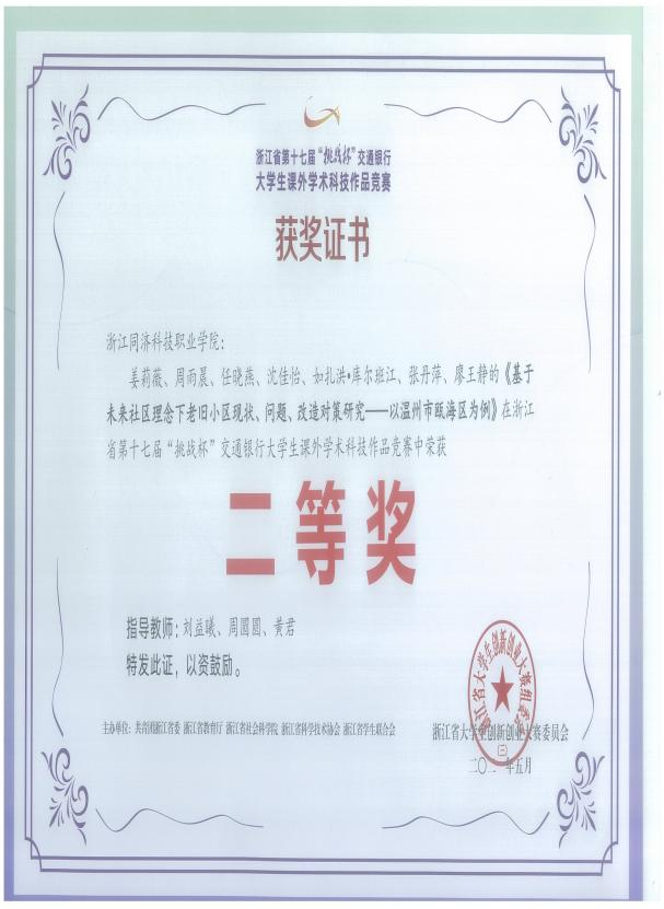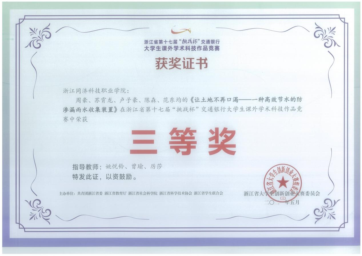 本次大学生课外学术科技作品竞赛对象包括浙江大学在内的本科学校和职业院校项目同赛道竞技,竞争非常激烈。我校艺术设计学院刘益曦、周圆圆、黄君老师指导的《基于未来社区理念下老旧小区现状、问题、改造对策研究——以温州市瓯海区为例》晋级决赛并荣获二等奖。另外,建筑工程学院周培娇、蒋晓冬、郑传娟指导的《一种用于建筑工地喷雾降尘的联动装置》,水利工程学院张舒羽、马继侠、虞佳颖指导的《奇观·情怀·精神——海宁潮文化调查报告》,水利工程学院胡玉珊、屈兴红、陈福运指导的《浙江省山区农饮水水质状况调查分析——基于浙江省400余个农村供水工程的调研》,水利工程学院姚悦铃、曾瑜、厉莎指导的《让土地不再口渴——高效节水的防渗漏雨水收集装置》,经济与信息学院李爱红、王志远、徐骏骅指导的《传承非遗文化赋能乡村振兴:桐乡蓝印花布印染技艺传承与发展调查研究》,水利工程学院马继侠、张舒羽、虞佳颖指导的《水资源日益紧张背景下的企业用水效率研究——基于萧山区取水工程现状调查》等6个项目获得大赛三等奖。