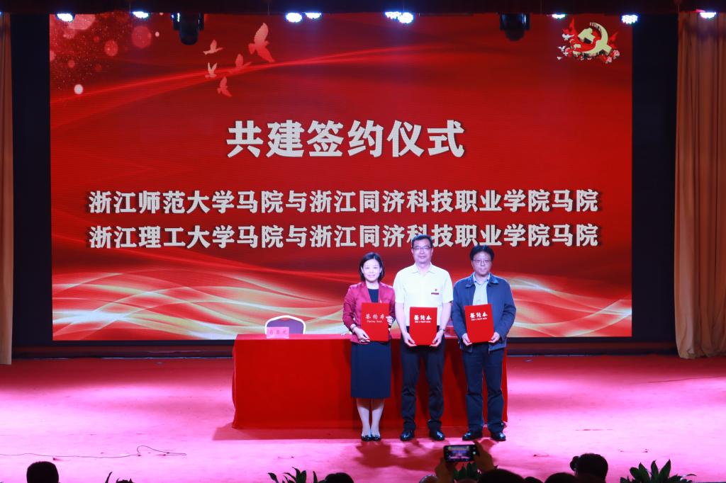会上,浙江师范大学马克思主义学院周志山院长,浙江理工大学马克思主义学院肖香龙副院长作为共建单位领导,与我校党委委员、宣传统战部部长、马院党支部书记吴敏启签署校马克思主义学院共建协议。双方将本着合作帮扶,互学共建,资源共享,共谋发展的原则,开展战略合作,进一步提高思政教师的教学科研能力和社会服务能力,提升师资队伍建设水平。