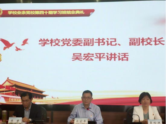5月20日中午,学校业余党校第四十期学习班结业典礼顺利举行。学校党委副书记、副校长吴宏平,学校党委委员、组织部(人才办)部长(主任)吴玲洪出席,学工部负责人、各二级学院党总支书记、组织员及全体学员参加典礼。