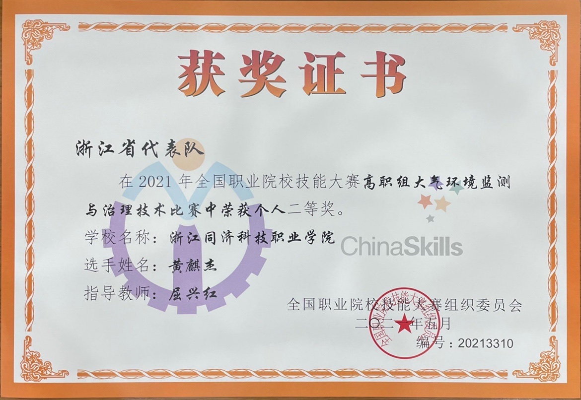 6月27日,2021年全国职业院校技能大赛高职组“大气环境监测与治理技术”赛项在河北工业职业技术大学圆满闭幕。此次大赛为期2天,来自全国26个省、自治区、直辖市的代表队进行激烈角逐。我校水利工程学院屈兴红老师带领的水工1902班黄麒杰同学,代表浙江省以全国总成绩排名第四的好成绩荣获国赛二等奖第一名,在参加本次竞赛的9所水利院校中排名第一。