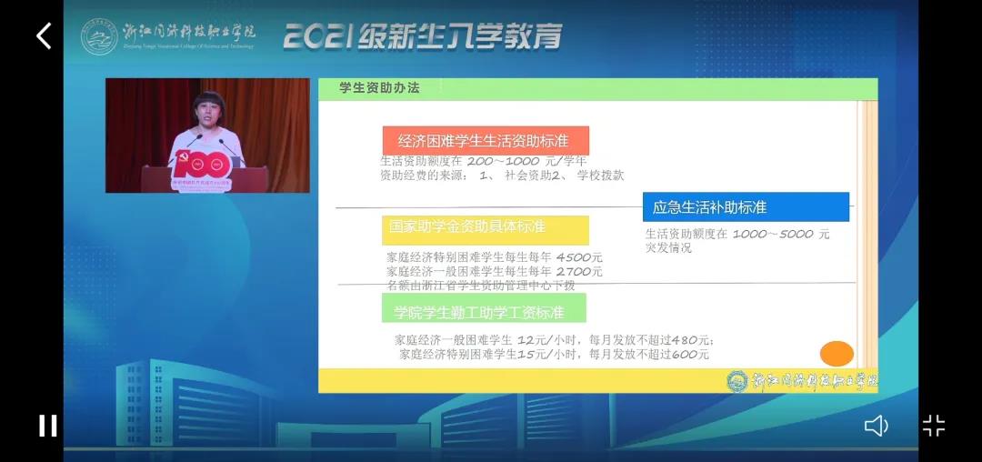 2021级新生入学教育采用线上和线下教育相结合的方式,全程直播。线下场在瓯江楼小剧场举行,学工部、教务处、保卫处、后勤服务中心(医务室)、图书馆五部门共6位校内外老师面向全体2021级新生代表分别从学生制度、安全教育、入学心理适应、健康防疫、图书馆入馆教育等方面进行了宣传教育,帮助新生更快适应大学生活。