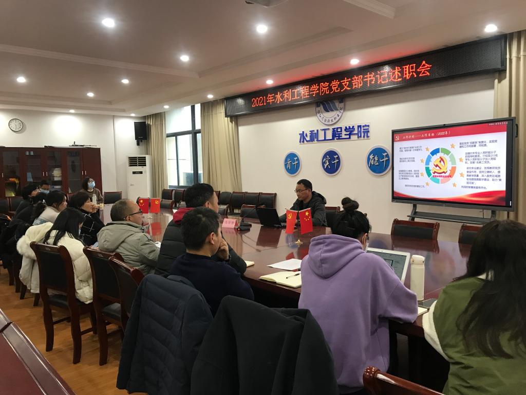 水工党支部书记厉莎、测量党支部书记刘勇、水生态党支部书记李若华、水管党支部书记朱友聪、学生党支部书记许源分别围绕党史学习教育、思想政治与意识形态工作、党风廉政建设工作、师德师风建设,以及在双高建设、科学研究、教学改革、基地建设、社会服务、生态兴水、疫情防控等工作中发挥先锋模范作用等方面依次进行述职。各党支部书记在述职报告中深度分析和查摆存在问题,提出解决措施,明确2022年党建工作计划。