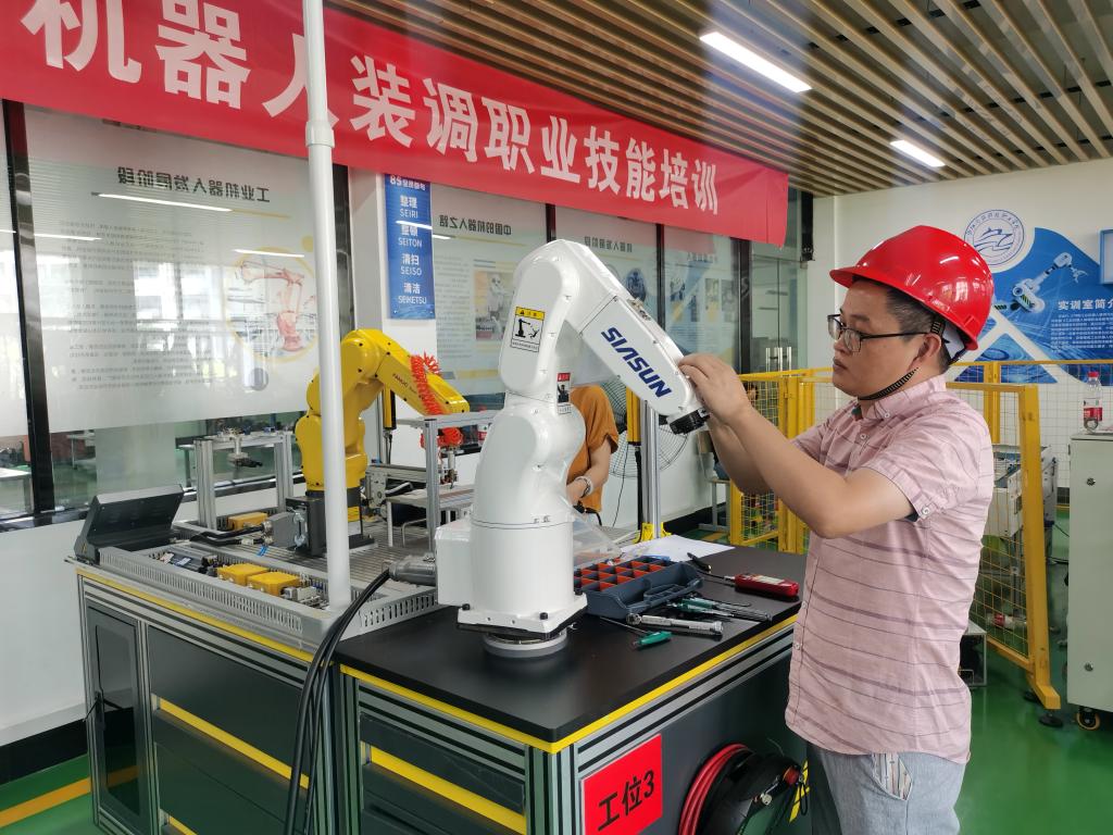 2022年8月15日至8月20日,“1+X”工业机器人装调职业技能等级证书师资培训成功在我校机电学院举办。此次培训以中级考核为目标,按照国家和第三方评价机构设置的标准,内容包含工业机器人基本操作、坐标系建立、路径规划、搬运编程、工业机器人数据通道及外围设备功能控制;PLC和机器人、立体仓库、变位机、相机、RFID等的通讯编程;机器人拆装等。最后进行中级考核师认证考核。培训老师循序渐进地进行教学,讲解与实操并行,理实一体化。