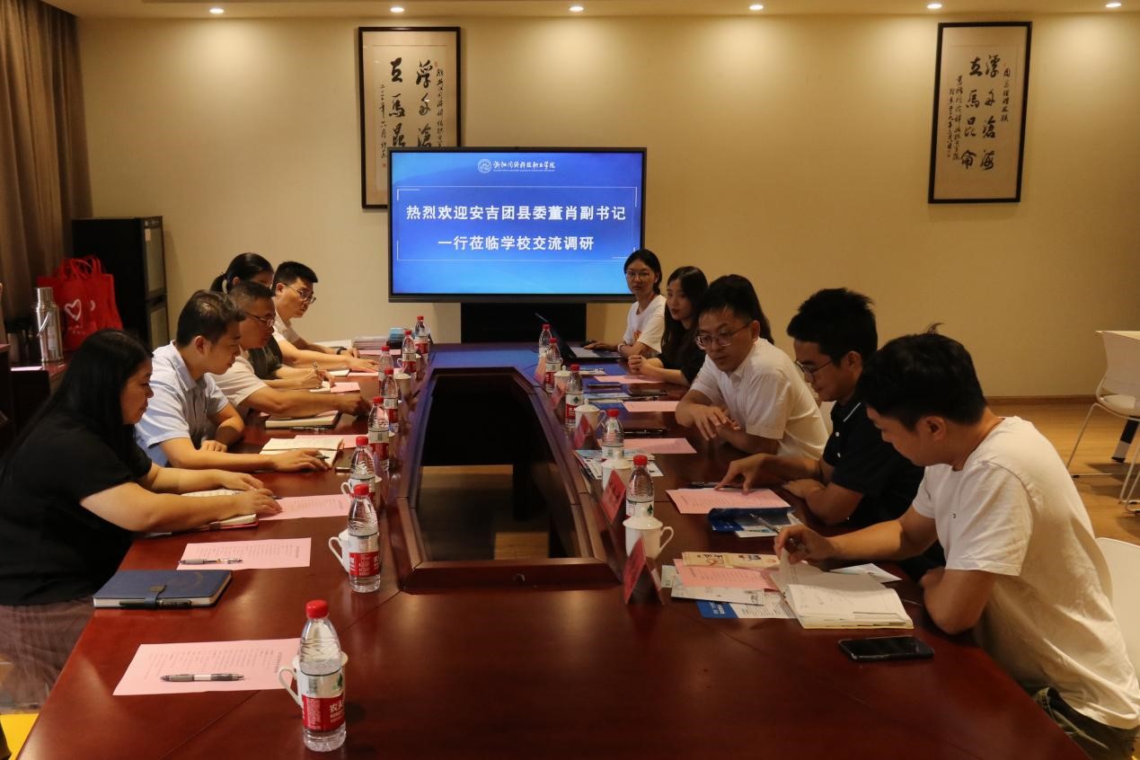 9月23日下午,安吉团县委董肖副书记一行来校开展走访调研,学校学工部、团委相关负责人和教师代表、大学生创业团队项目负责人以及安吉籍学生代表参加了交流活动。