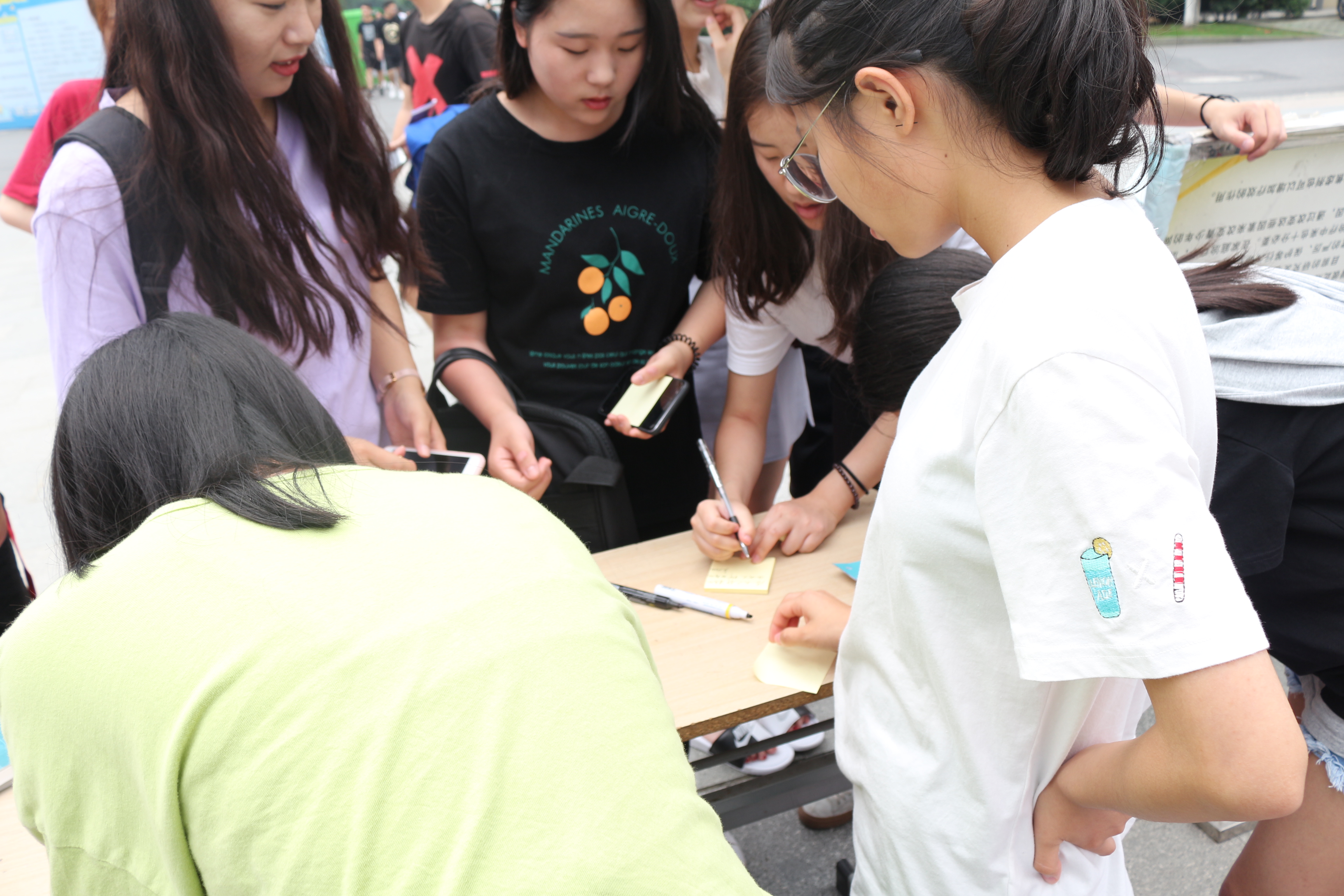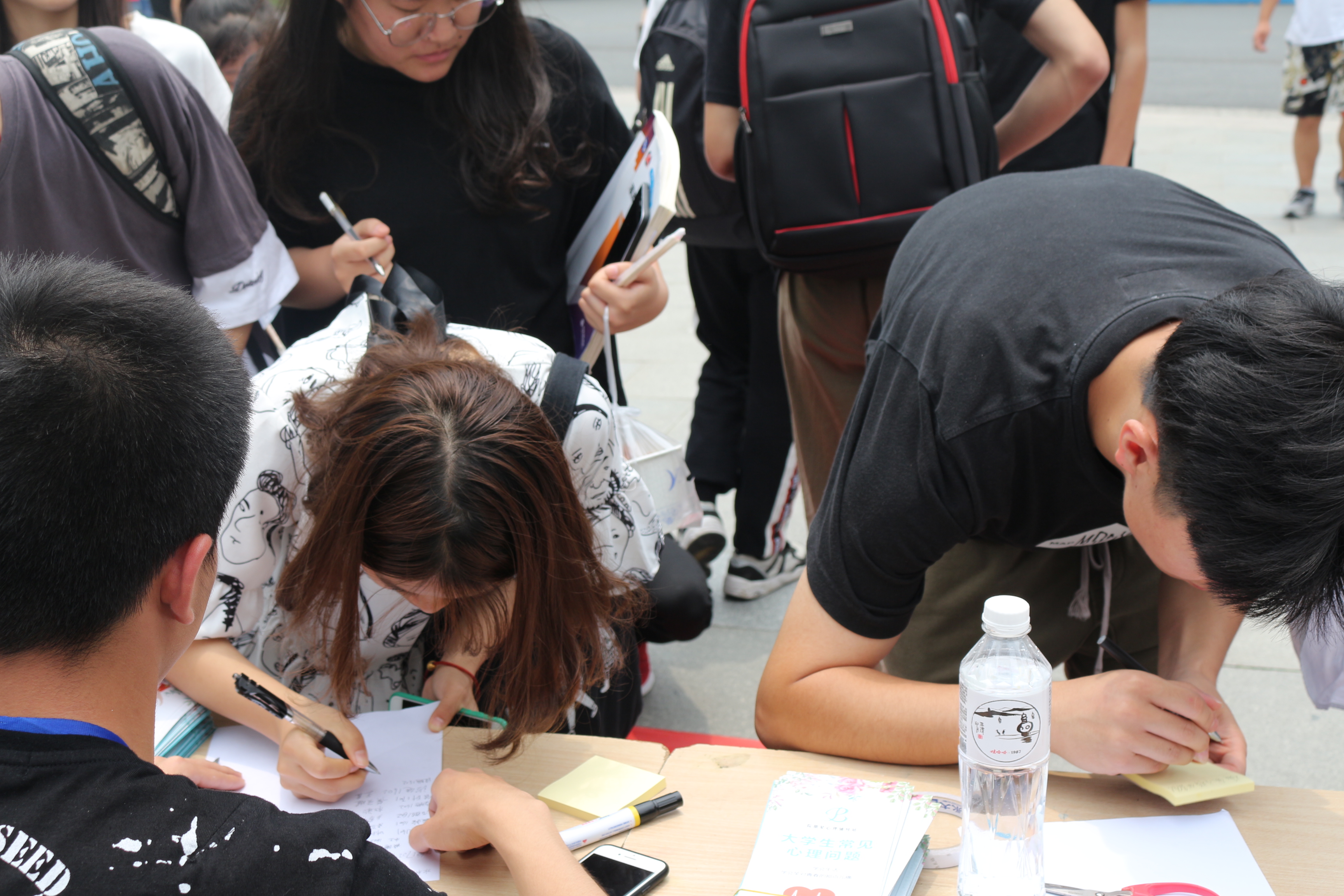 我院已经连续十余年开展以5.25大学生心理健康日主题活动,通过举办心理活动,积极进行心理知识的普及与心理健康理念的传播,增强全院师生的心理健康意识,保持良好向上的心理状态。本次活动由四大部分组成,分别为心理知识宣传、5.25横幅签字、“我与我的1001问”、“烦恼消消消”组成。大家通过阅读《大学生常见心理问题》手册,了解自我心理调节方式,提高自我心理健康关注意识。第三部分“我与我的1001问”通过三句话“像我这样XX的人”填写,让同学们反思了自我,提高对自我的认识。最后,“烦恼消消消”活动让贴着烦恼、暴躁、迷茫的纸条的拖鞋,轻轻的抬起脚,向前一蹬,那些坏情绪飞向远方。