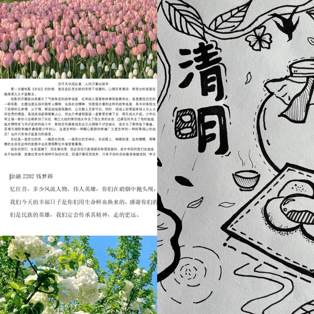 绘清明,同学们用画笔绘出“最美人间四月天”的美景,用指尖笔墨来表达对故人的思念之情,讲述清明节的文化内涵;怀英烈,通过观看《建军大业》《长征》等红色影片,领略革命先烈的英勇风采,体会激情澎湃的内心感受,彰显出紧握先辈手中接力棒的决心;话清明,通过诵读诗词的方式缅怀先人,寄予哀思,表达对英烈的怀念、对历史的敬畏;踏清明,用相机记录下春天的足迹,踏着轻盈的步伐,乘着温柔的春风,观赏着大自然的美景;寄清明,用网络留言的形式记录下对革命先烈的怀念之情,表达着对革命先烈最崇高的敬意。本次活动通过多种方式充分调动学生积极性,共收获各类作品680余件。