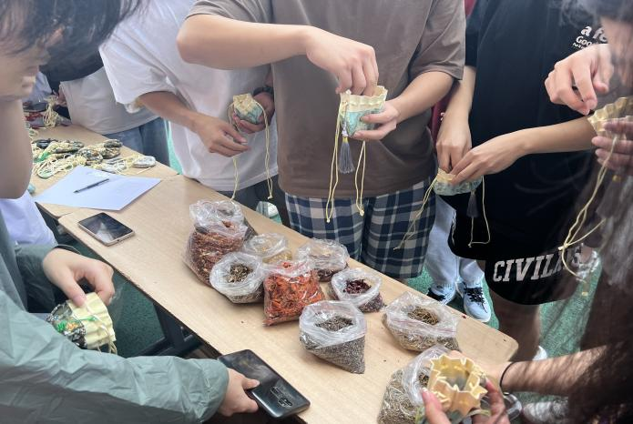 活动中,同学们来到操场领取香包,选择各类香料,学习收结方式,将制作完好的香囊送至朋友或亲人。“彩线轻缠红玉臂,小符斜挂绿云鬟。”五彩绳是端午的吉祥物,有着祈福纳吉的美好寓意。报名参加活动的同学们在学长、学姐的指导下自学自编五彩绳,克服困难、磨炼心性,在团结、友爱的活动氛围中完成了五彩绳的编织。